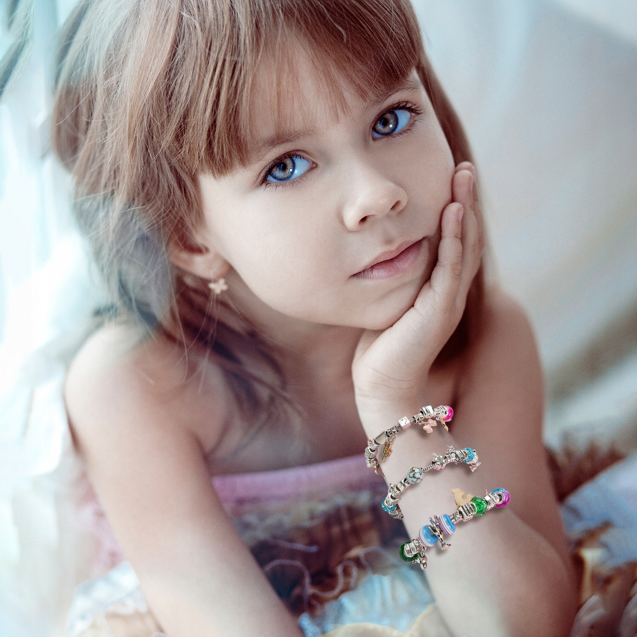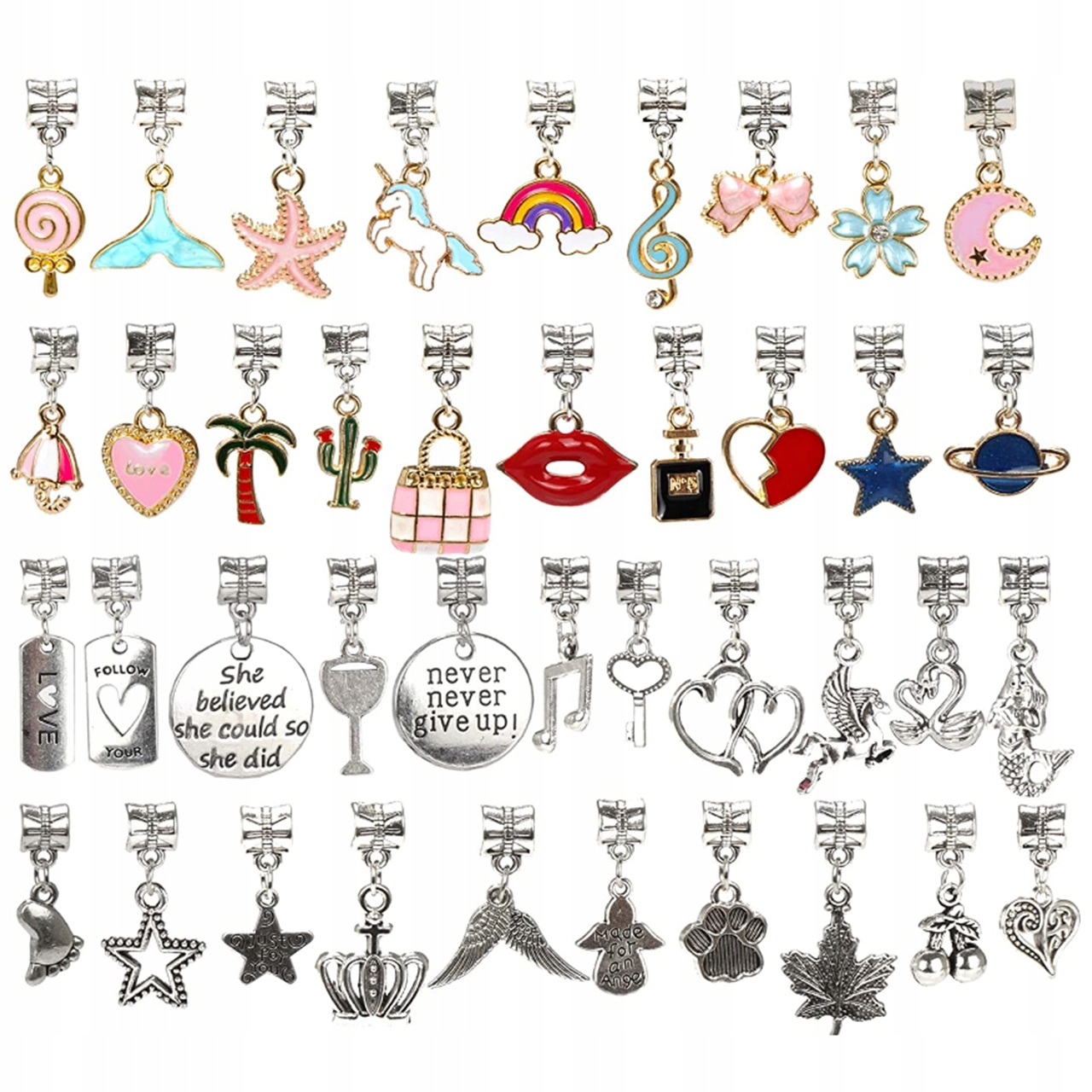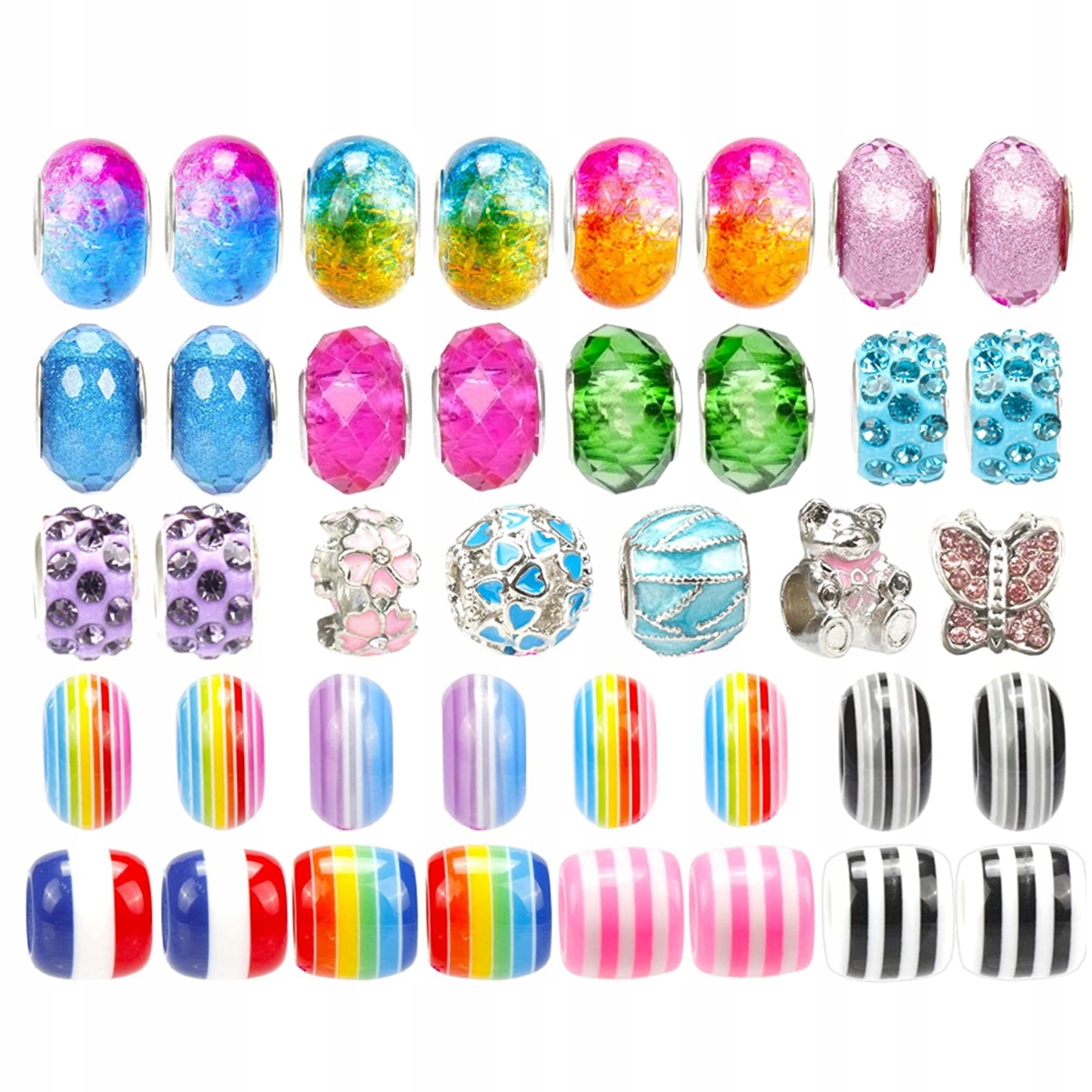 В набор входят разноцветные и металлические бусины различной формы, а также металлические бусины с различными подвесками. Все элементы можно нанизать на один из пяти браслетов или пяти ремешков, длина которых регулируется.