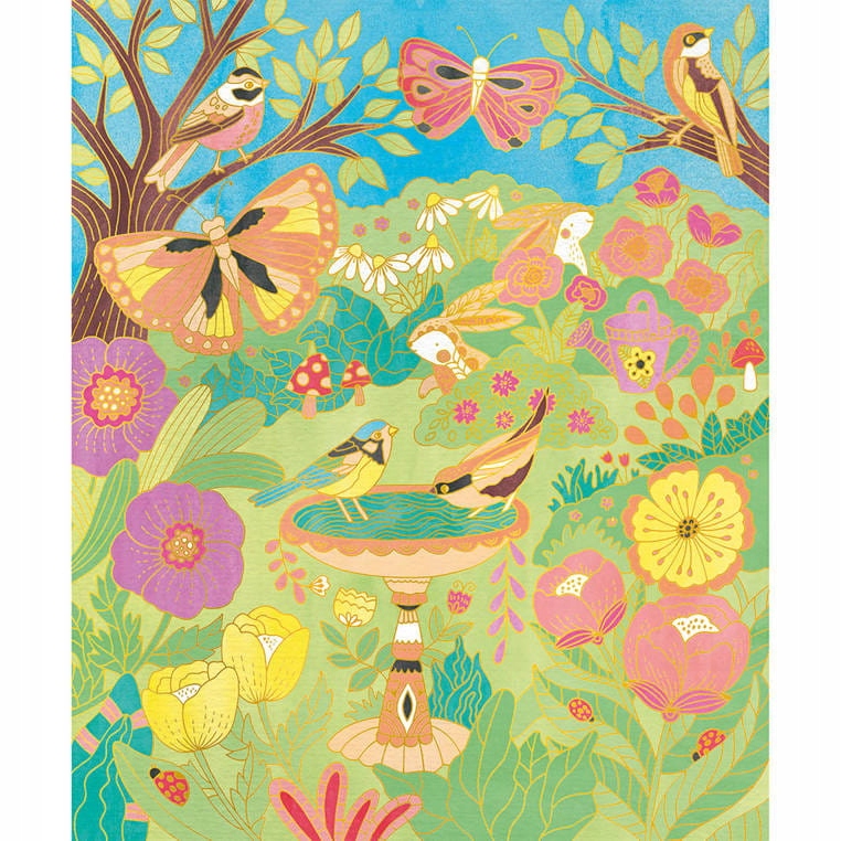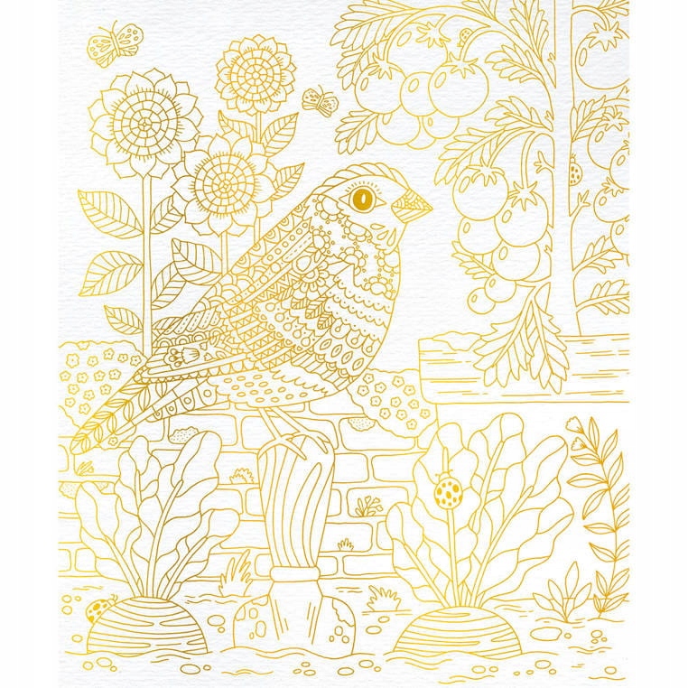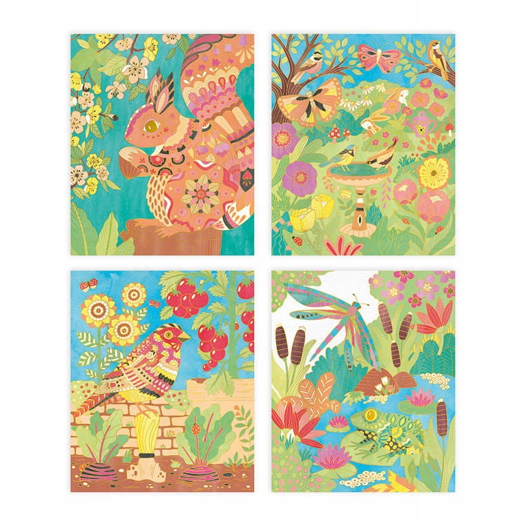 Креативный набор Golden Contours Garden от французского бренда JANOD состоит из 4 фотокарточек с садовыми существами и яркими растениями: в него входят, среди прочего: белка, птицы, бабочки и стрекоза. На белых досках видны четкие, слегка выпуклые золотистые очертания всех элементов изображения. Задача — точно — с помощью прилагаемой специальной тонкой кисточки с ёмкостью для воды — заполнить пространство краской, согласно инструкции (контуры предотвращают смешение красок и облегчают эстетическое исполнение работы).