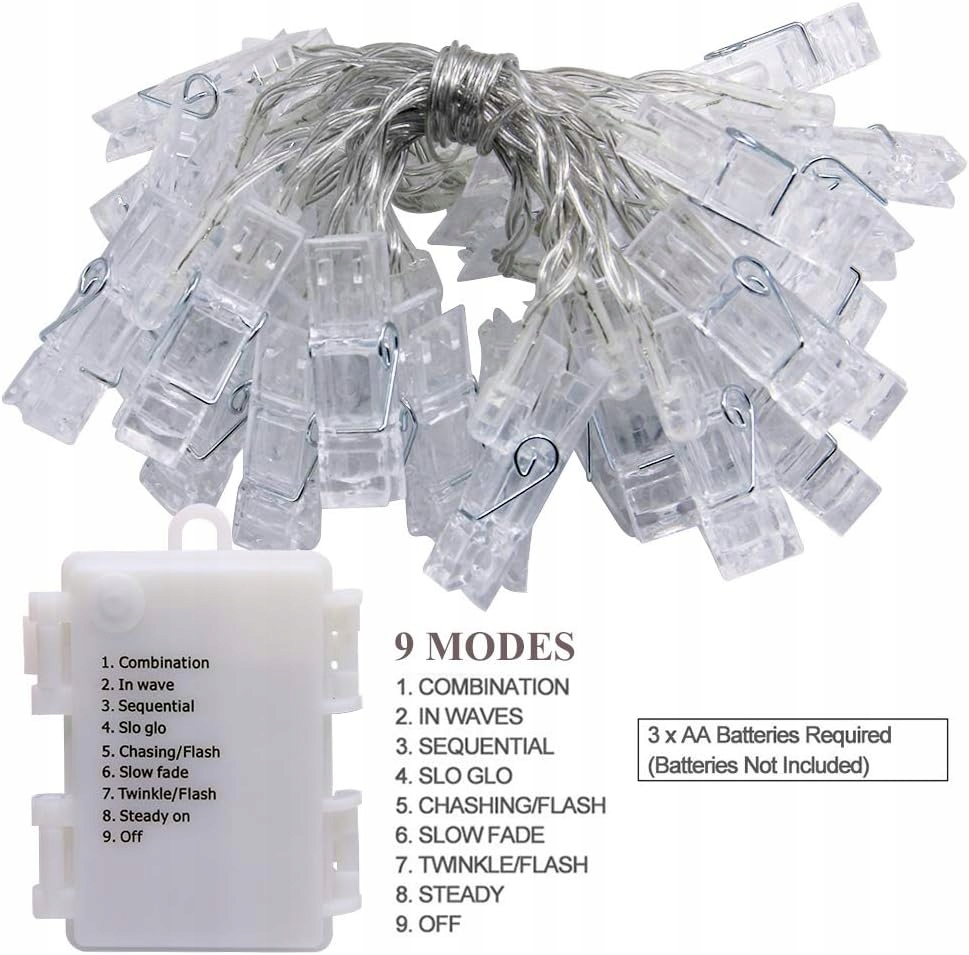Фотоклипы для украшения:Общая длина гирлянды составляет 5 м и содержит 40 прозрачных фотоклипов (LED), расстояние между клипсами – 13 см. Каждый зажим содержит светодиодную подсветку, что делает его действительно интересным способом демонстрации праздничных открыток, фотографий, произведений искусства и подвешивания легких предметов. Портативная гирлянда в ваших руках дает вам безграничные возможности, вы можете повесить светильники по своему усмотрению.