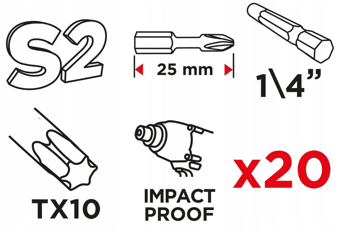 TX10 x 25 мм удары, 20 штук 56H549 по графиту представляют собой набор из 20 частей прочных битов TX10 удара с общей длиной 25 мм. Аксессуары изготовлены из твердой стали S2, квадратного размера ¼ ”.