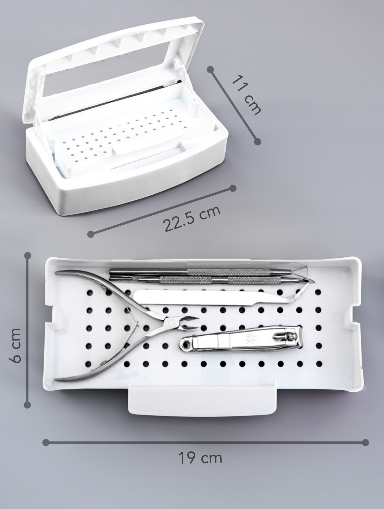 Контейнер идеально подходит для стерилизации косметических инструментов, таких как кусачки, шпатели, ножницы, накатки, пинцеты и многих других мелких предметов, металлических устройств. .