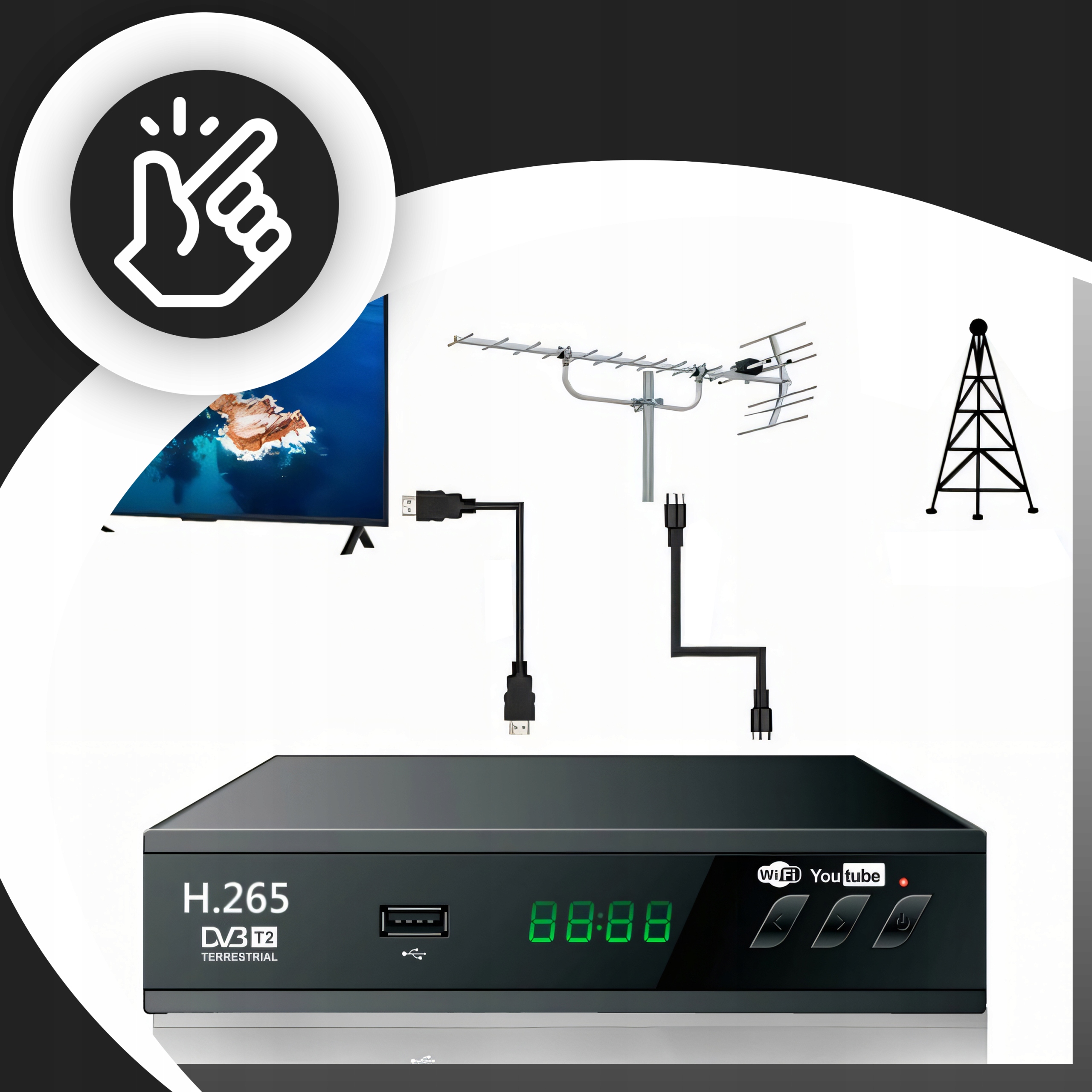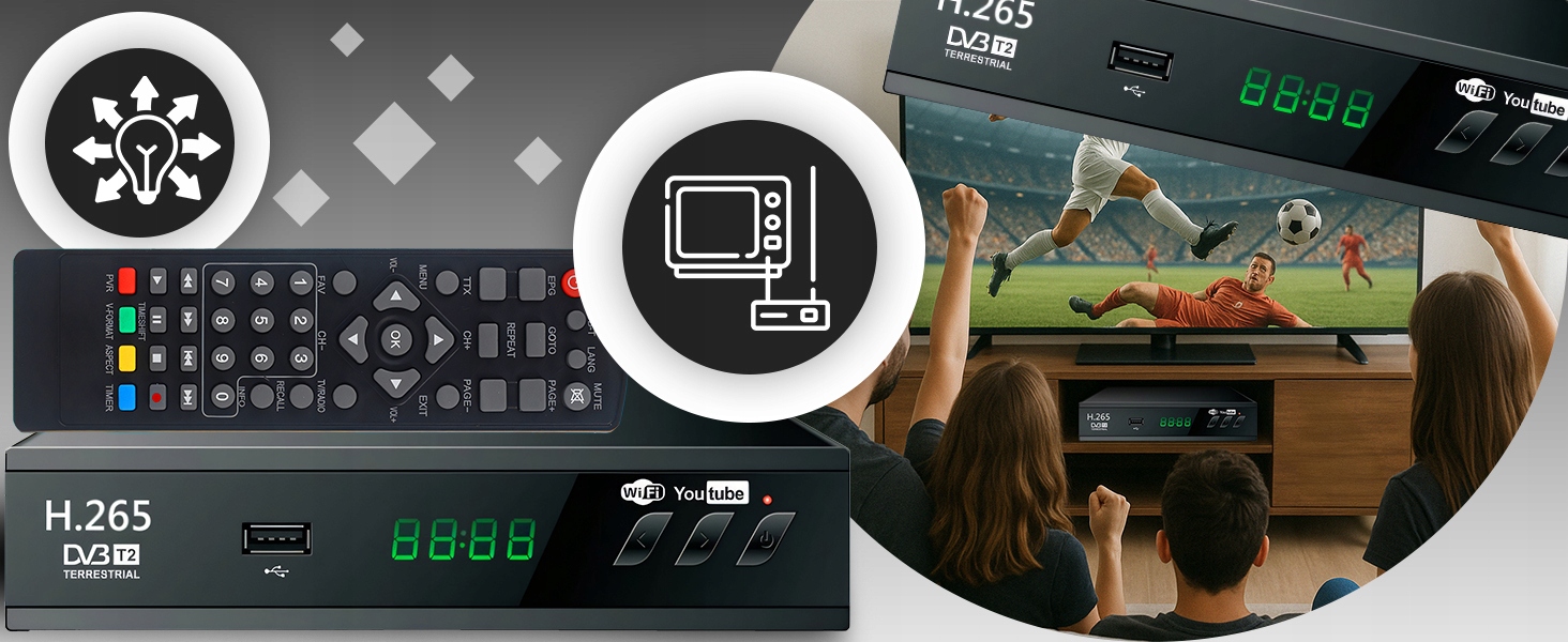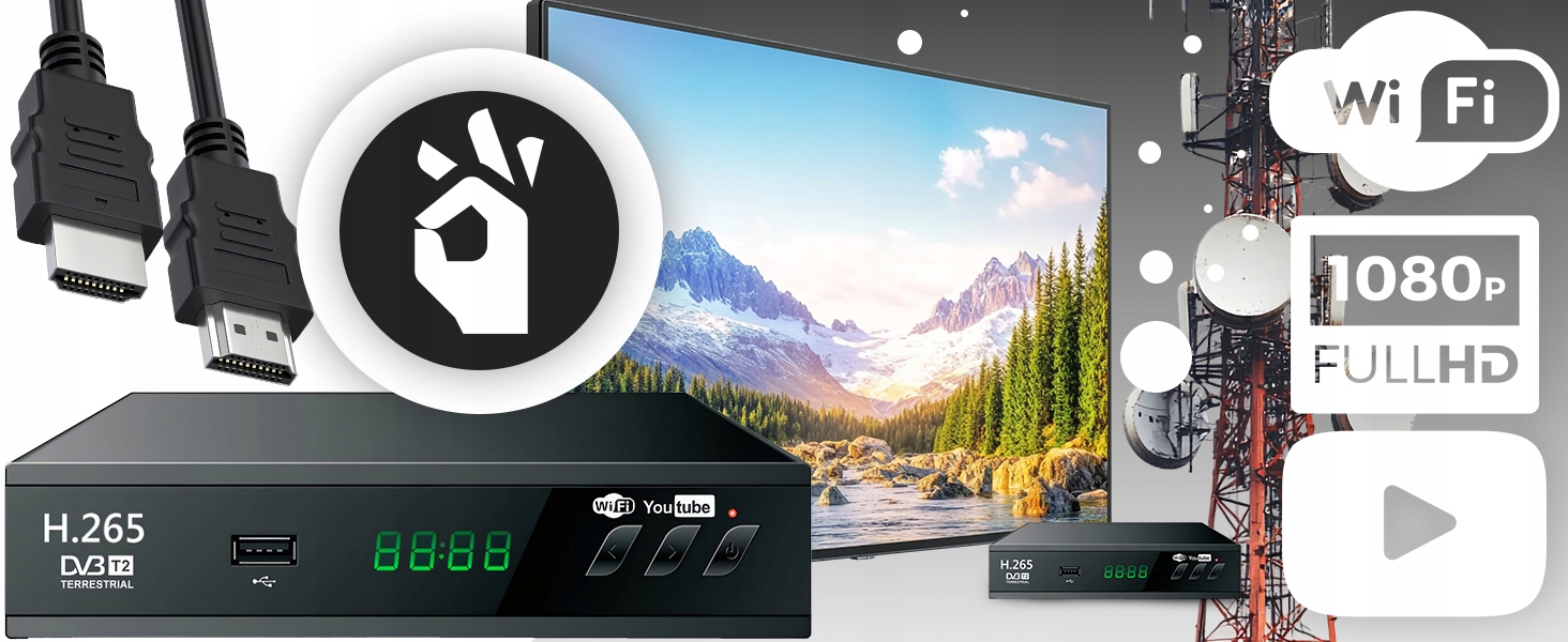 - Современный DVB-T2/HEVC/H.265 Standard -guartes Отличное изображение и качество звука с минимальной полосой пропускной способности. WiFi - обеспечивает легкий доступ к мультимедиа и Интернету.