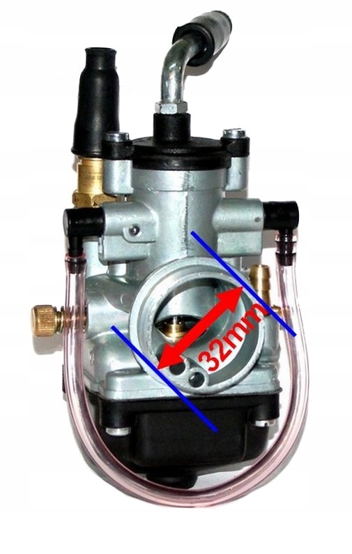 Диаметр горловины карбюратора 21мм! Диаметр воздуховыпускного отверстия 25 мм. Диаметр воздухозаборника до уменьшения 32 мм, после уменьшения 60 мм. Редукция позволяет установить воздушный фильтр большего размера, но его также можно открутить. Увеличенные внутренние каналы позволяют улучшить параметры работы двигателя, что увеличивает ускорение и максимальную скорость автомобиля. В комплекте 7 тюнинговых форсунок -0,75 - 0,80 - 0,85 - 0,90 - 0,95 - 1,00 - 1,05 (одна из них уже вкручена в карбюратор). Отличное качество изготовления! Отличная замена заводскому карбюратору. Он также идеально подходит для настройки цилиндров. Карбюратор имеет возможность подключения вакуумной линии от топливного крана и линии маслораздачи (масляного насоса). Карбюратор имеет два патрубка для вентиляции поплавковой камеры