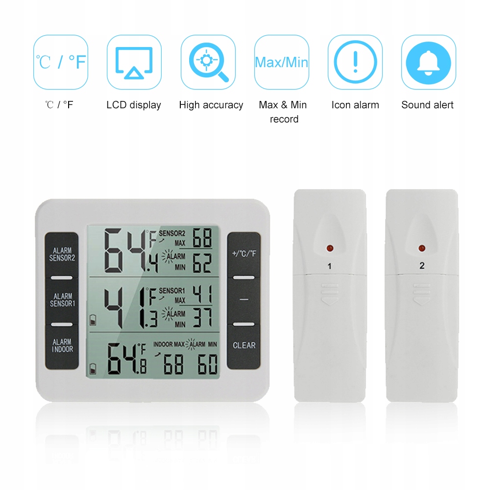- Три температурного монитора: температурный измеритель, изготовленный из постоянного высокого качества корпуса АБС, оснащен 2 датчиками (расстояние сигнала: 100 м/328 футов), может одновременно отслеживать температуру 3 мест.