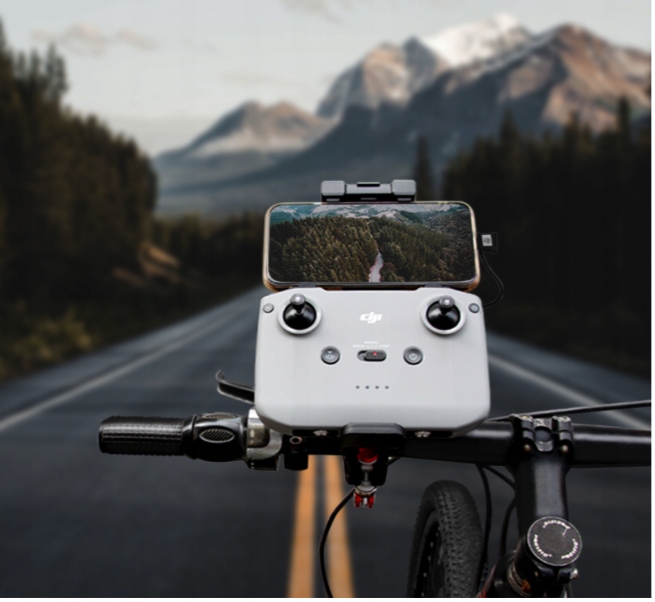 Инновационный держатель для контроллера дрона DJI, позволяющий разместить оборудование управления на руле велосипеда. Он позволяет удобно управлять дроном даже во время вождения.