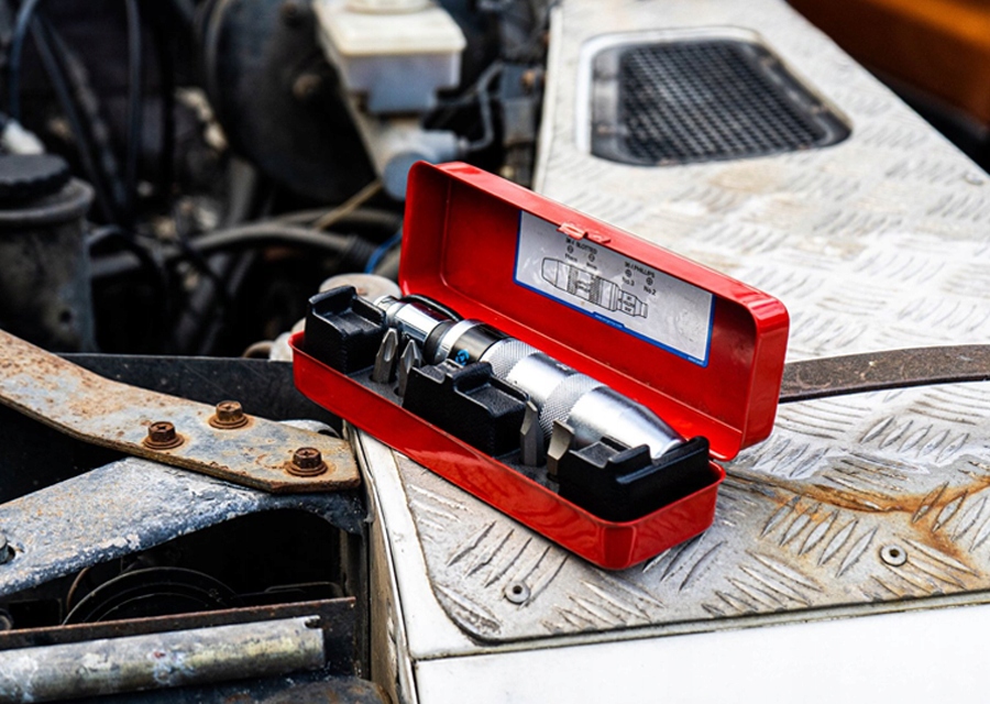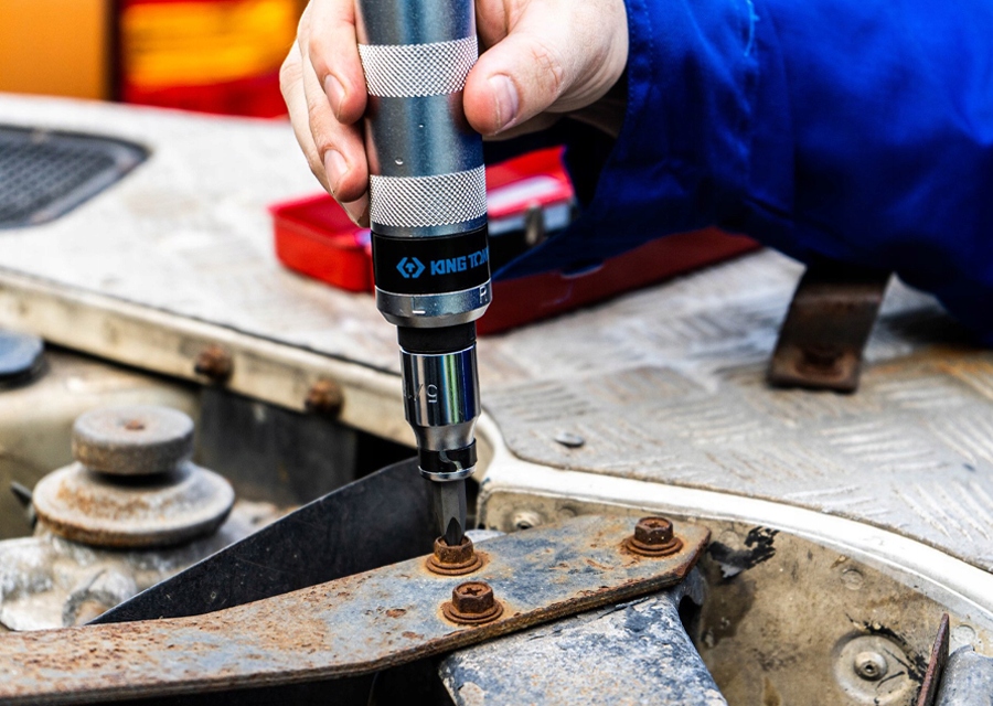 Отвертка – компактный инструмент, сочетающий в себе высокое качество материалов, удобство в использовании и эргономику работы. Отвертка используется для отвинчивания и ослабления застрявших или туго затянутых болтов, винтов и гаек. Для работы он использует изменение кинетической энергии, возникающей при ударе молотка, во вращательное движение кончика отвертки. Такой метод работы обеспечивается точной червячной передачей с резьбой с большим шагом. Отвертка имеет ручку направления вправо/влево. Инструмент очень часто используется в механических и автосервисах. Все это заключено в металлическую коробку.