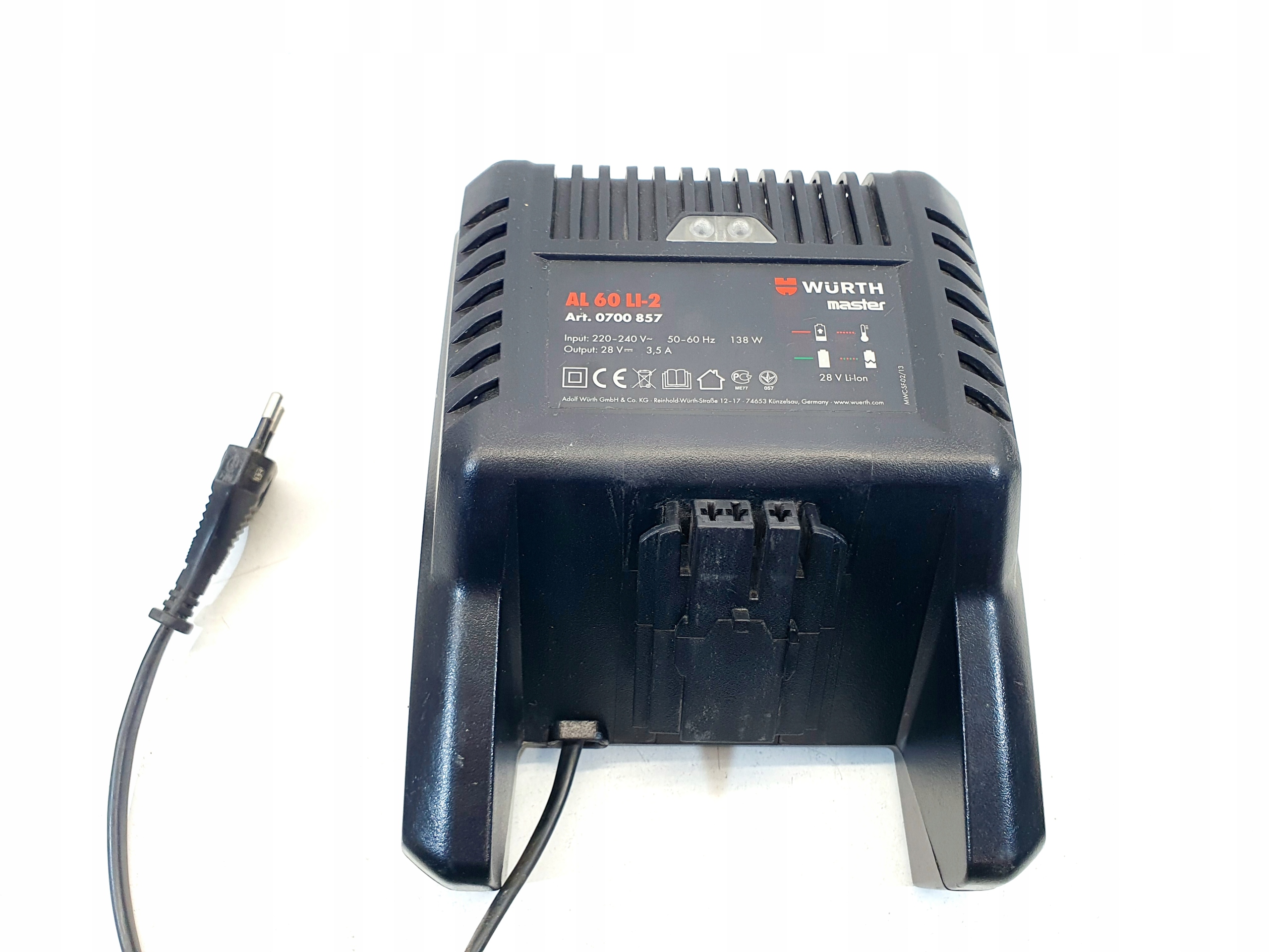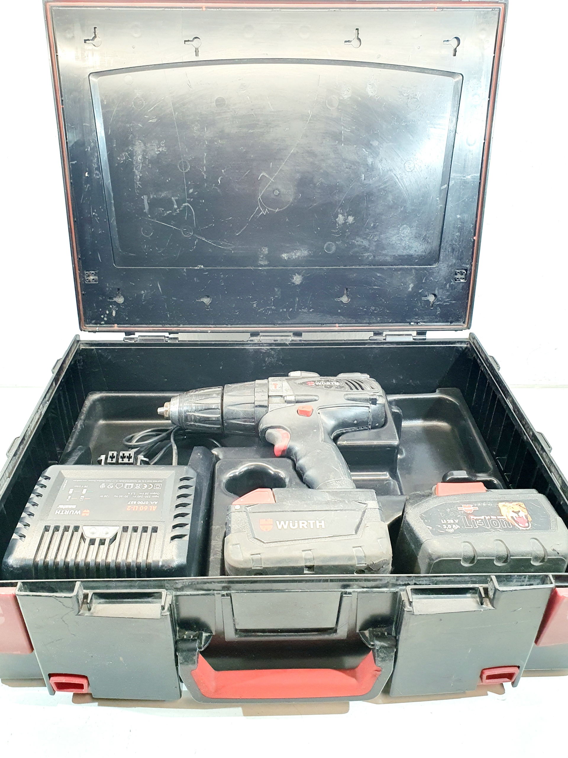 Ударная дрель-шуруповерт с питанием от аккумуляторов 28V WURTH, модель BS 28-A COMBI. Аппарат б/у, полностью рабочий, визуальное состояние хорошее. В комплект входят два аккумулятора 28 В/3,0 Ач, зарядное устройство и кейс для транспортировки. У чемодана повреждена одна петля.