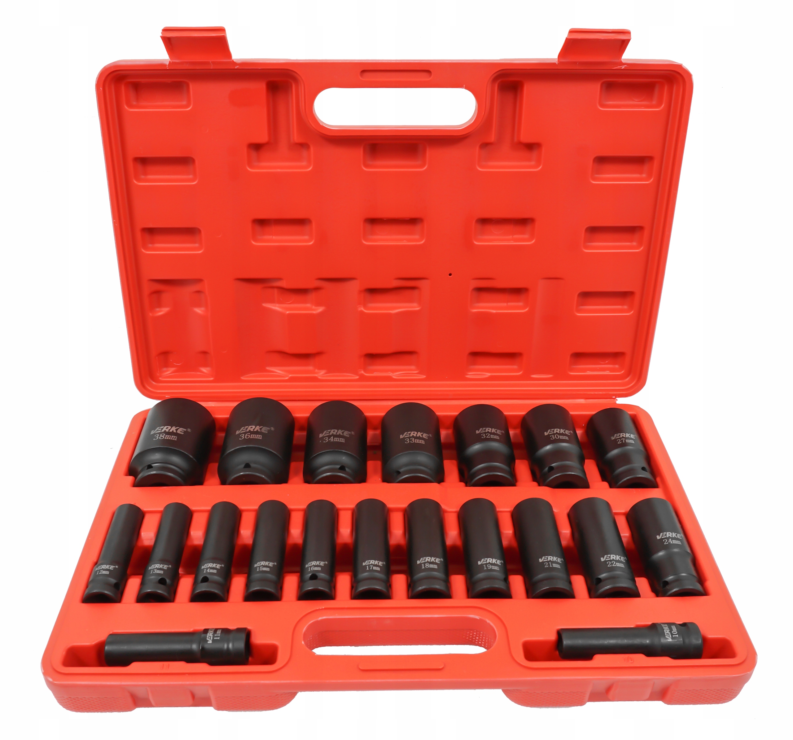 - Содержит шестигранные ударные головки популярных размеров от 10 до 38 мм.