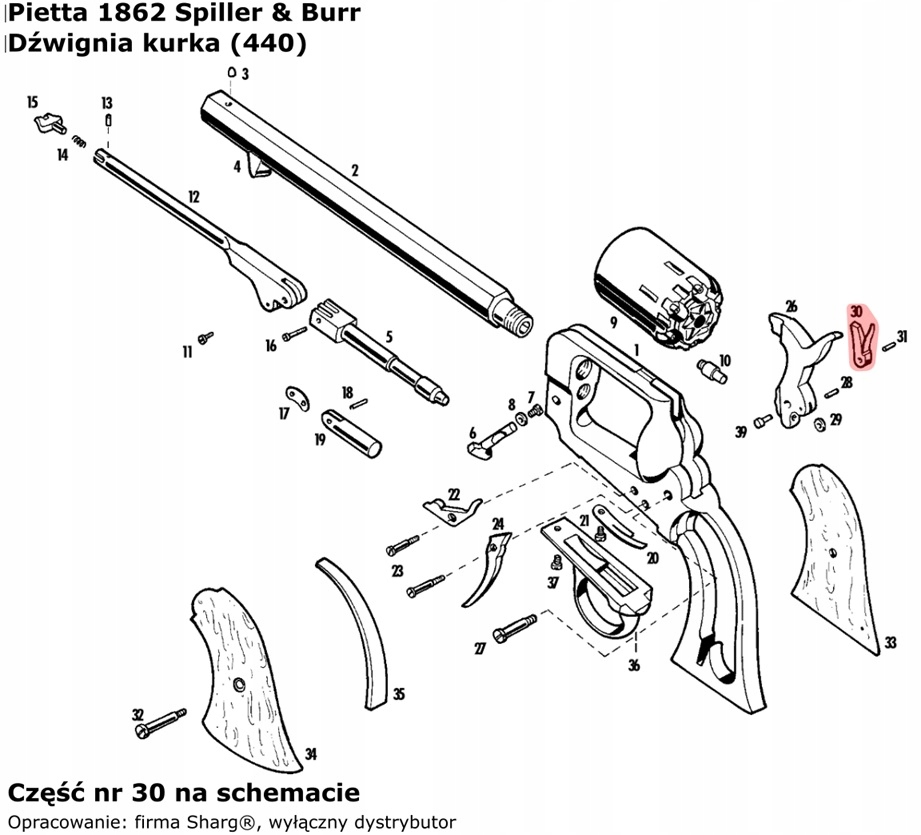 440 (служебный) курковый рычаг с пружиной. Для новой модели Remington Army/Navy 1858 года, новой модели Remington Army/Navy 1858 года из нержавеющей стали и револьверов Spiller & Burr 1862 года с черным порохом от Pietta. Технические данные: