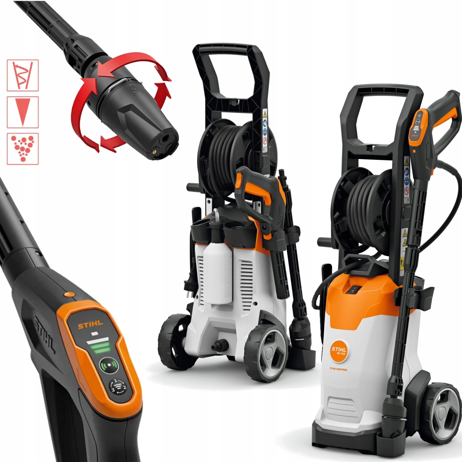 Исключительно удобная и легкая мойка высокого давления. Функция УПРАВЛЕНИЯ с регулировкой давления с помощью кнопки и светодиодного индикатора давления непосредственно на пистолете. Катушка для шланга (PLUS) для удобства обращения и хранения шланга высокого давления. Насадка 3-в-1 со встроенной вращающейся насадкой, плоской насадкой и насадкой для распыления чистящего средства. Эргономичное и безопасное хранение аксессуаров прямо на стиральной машине.