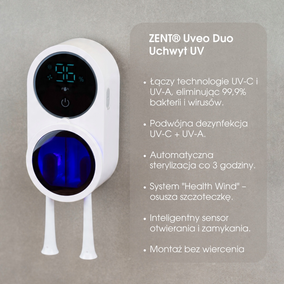 В домах, где несколько человек используют ванную, бактерии могут перемещаться между кистями, вызывая перекрестные инфекции. Zent® Uveo Duo эффективно защищает каждого члена домохозяйства от микроорганизмов на зубной щетке - это особенно важно в течение сезона гриппа или простуды.