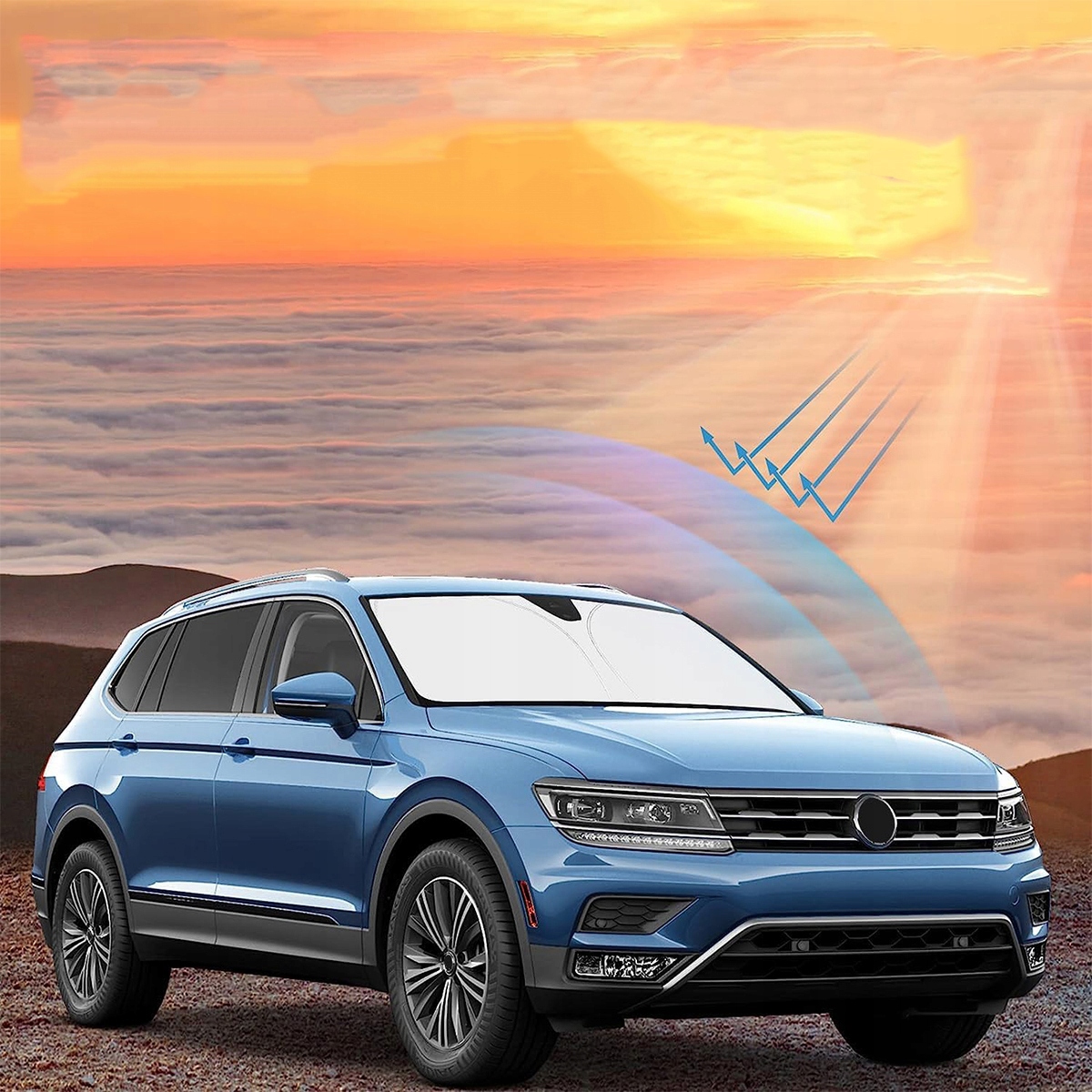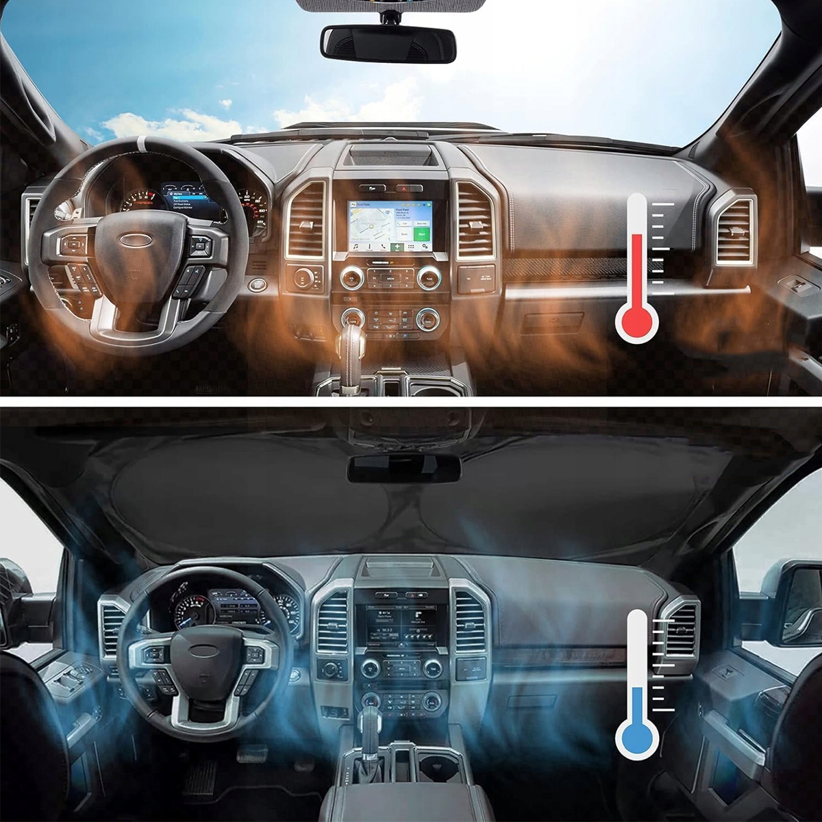 ✅ 【Эффективно защищает от жаркого солнца и жары】Серебряная сторона (снаружи) солнцезащитного козырька может отражать ультрафиолетовые лучи, предотвращая воздействие прямых ультрафиолетовых лучей на приборную панель и салон, черная сторона (внутри) может изолировать теплопроводность, сохранять прохладу салона и сидений, предотвращать выцветание и растрескивание, а также значительно сокращать время остывания автомобиля.