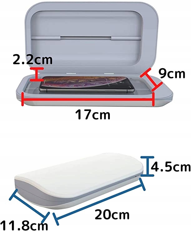 - Идеальный размер: коробку для дезинфекции можно использовать для мобильных телефонов размером до 7 дюймов. Внешние размеры УФ-стерилизатора — 20 х 11,8 х 4,5 см, внутренние — 17 х 9 х 2,2 см.