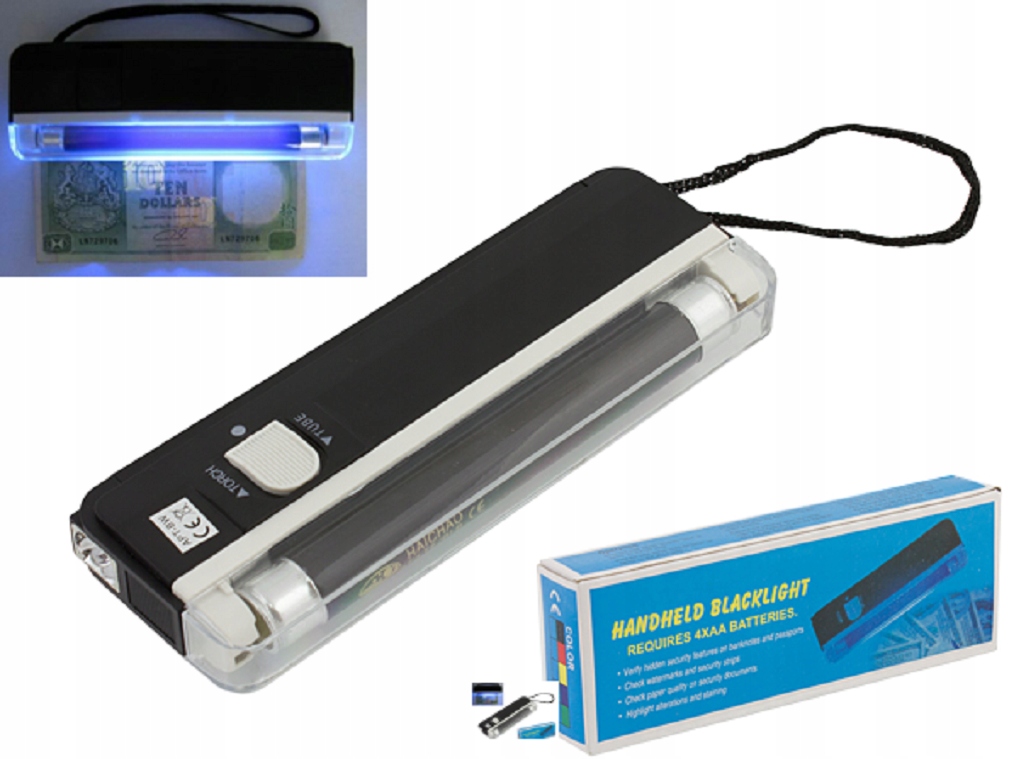 - УФ-лампа мощностью 4 Вт эффективно проверяет защиту от ультрафиолета банкнот, удостоверений личности, кредитных карт и всех других официальных документов.< /li>