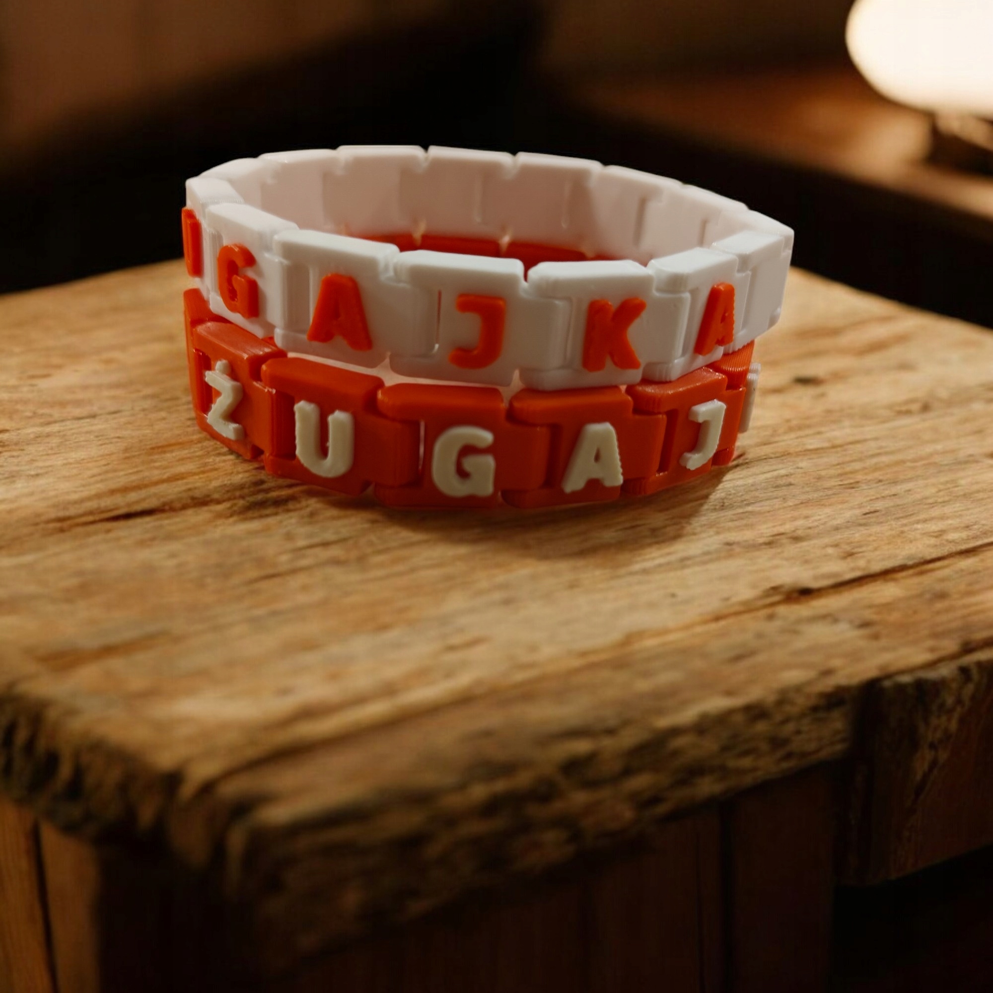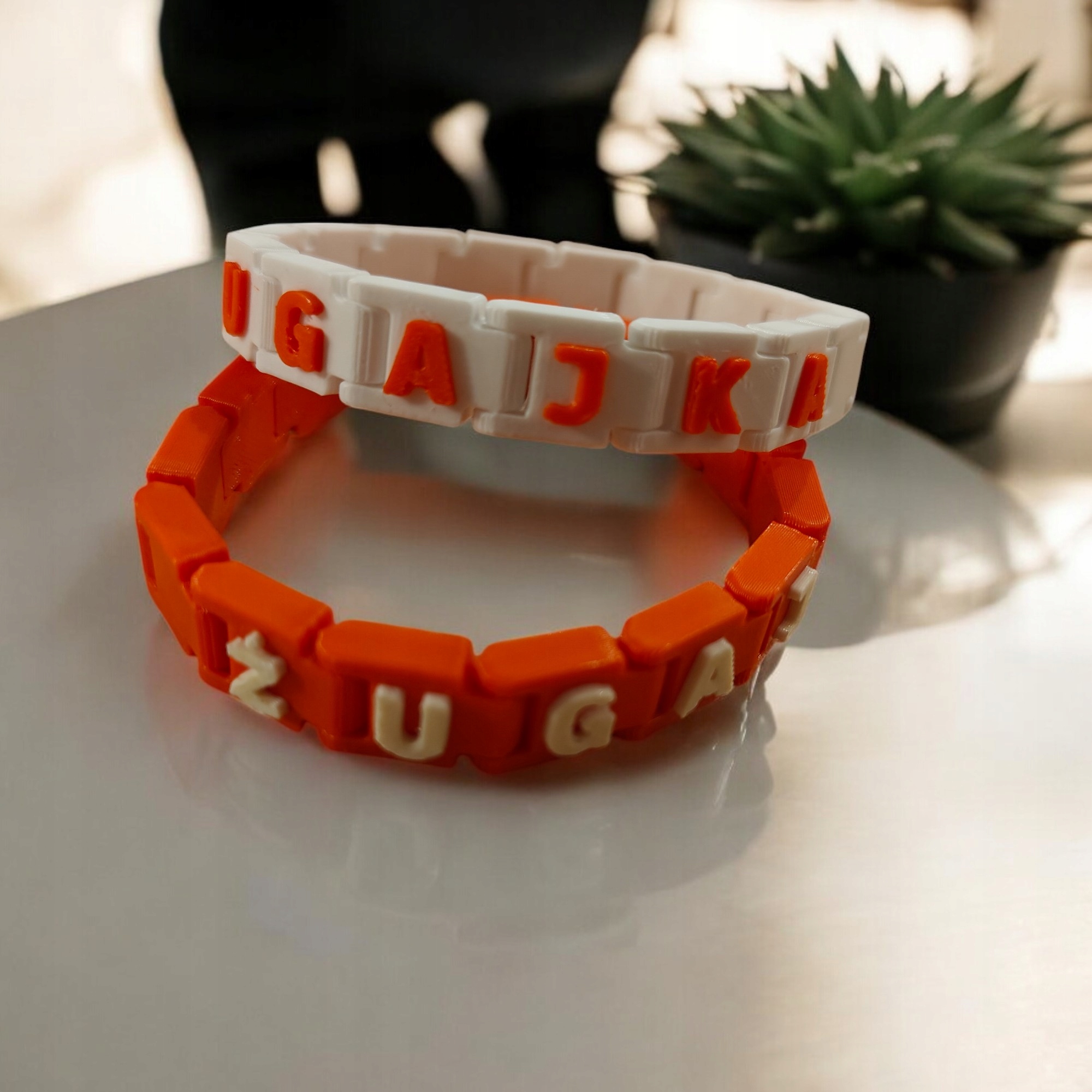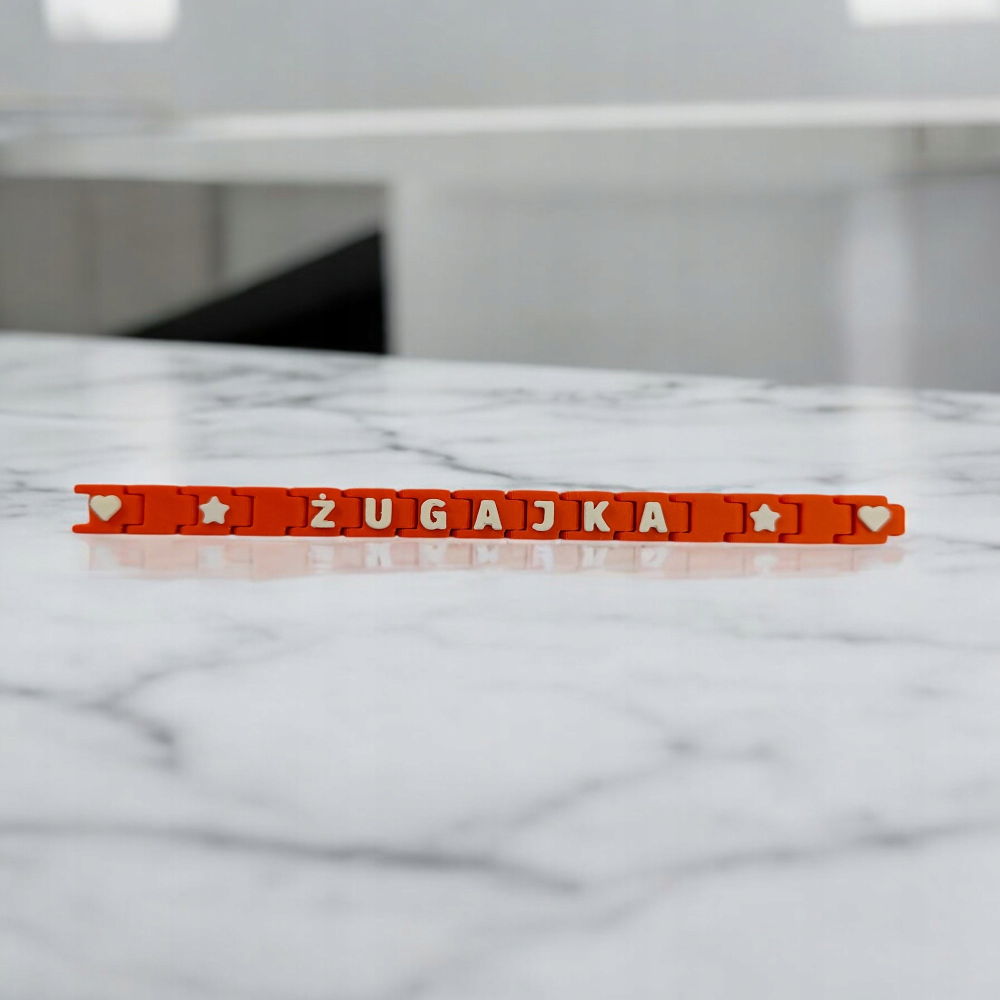 Браслет с энергетическими оранжевыми поясами идеально контрастирует с белыми буквами надписи «żugajka», создавая модное и эффективное дополнение. Браслет выделяется среди других аксессуаров, идеально дополняя каждую стилизацию молодых поклонников.