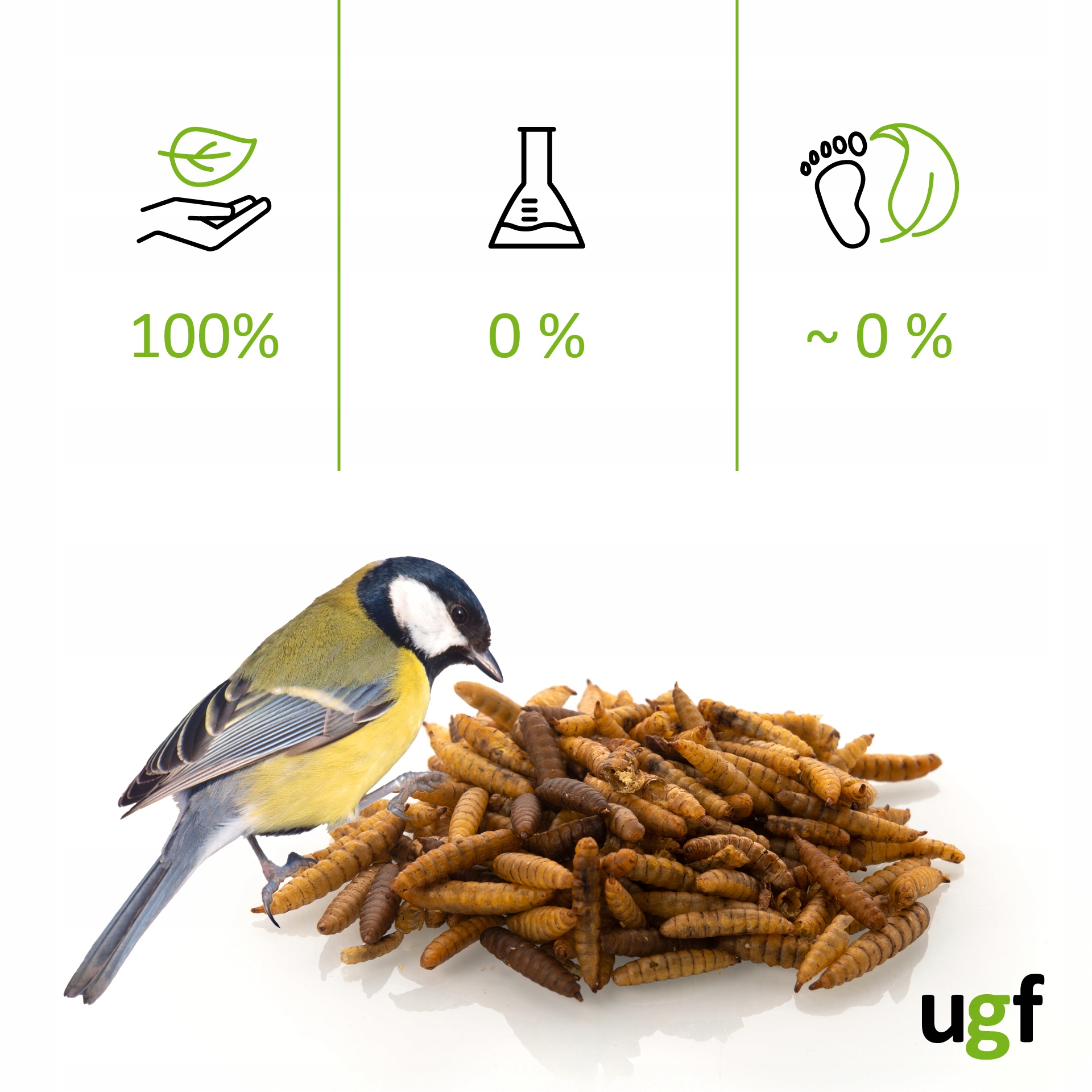 Личинки львинки (Hermetia illucens), также известной как ветковая муха, являются естественной пищей для широкого круга животных. Сушеные личинки — это 100% натуральная пищевая добавка для птиц, рыб, рептилий и мелких млекопитающих, таких как ежи, мыши и крысы.