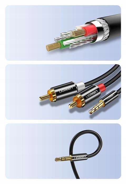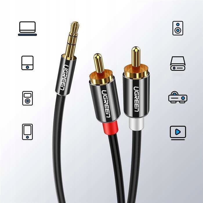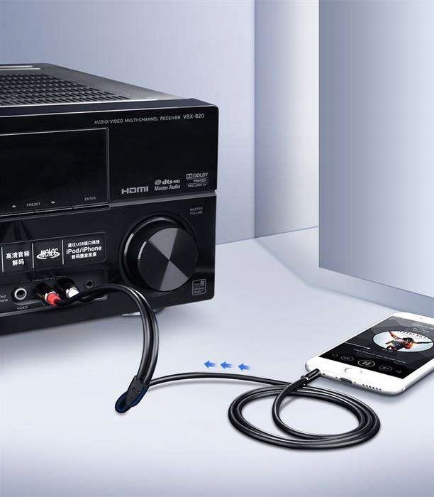Аналоговый аудиокабель от компании ugreen с одной стороны с 3,5 -мм -стереогнезом стерео и на двух других заглушках RCA. Это позволяет подключить телефон, смартфон или другое устройство для аудио оборудования.