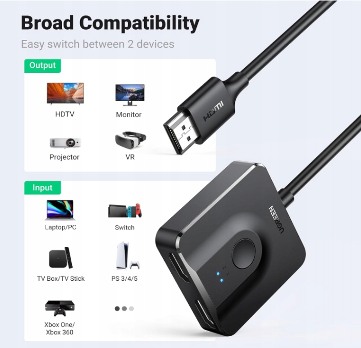 UGREEN 70607 HDMI-переключатель 2-в-1 4K 60 Гц – переключатель HDMI 2.0