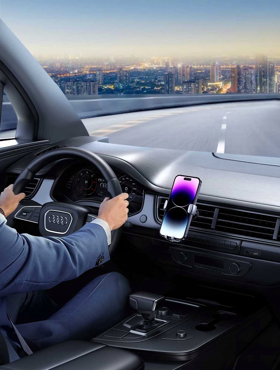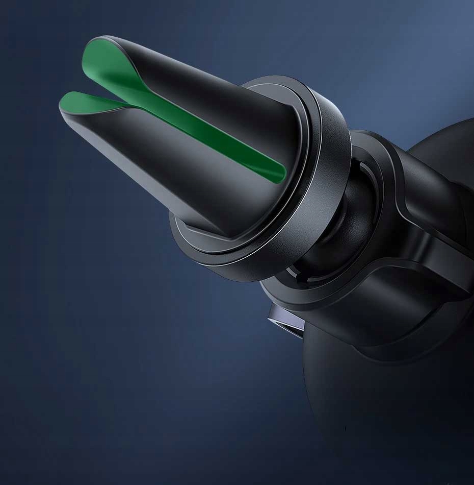 Автомобильный гравитационный держатель для крепления на вентиляционную решетку автомобиля. Гаджет чрезвычайно прост в использовании: просто положите на него телефон, и панели автоматически закроются. Он имеет треугольную структуру, обеспечивающую устойчивость во время движения, большие возможности регулировки (включая вращение на 360 градусов) и резиновые накладки, предотвращающие появление царапин на вентиляционном отверстии. Кроме того, имеется специальный вырез, позволяющий подключить зарядное устройство.