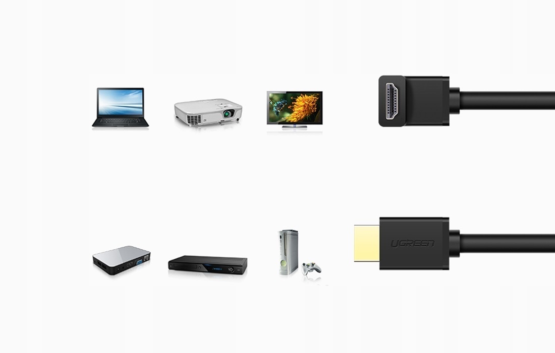 Кабель, позволяющий передавать изображение и звук с двух устройств с портом HDMI. Угол на одном конце кабеля составляет 90 градусов – это позволяет подключать различные устройства, где разъемы HDMI труднодоступны или требуют такого решения.