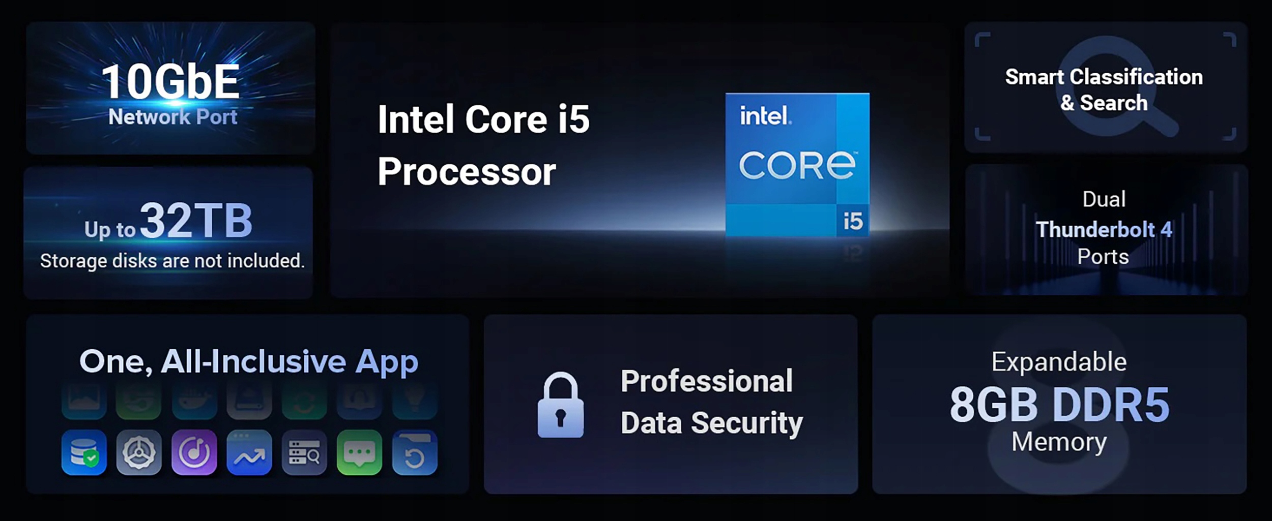 nas ugreen nasync dxp480t plus позволяет устанавливать до 4 м.2 м.2 SSD PCIe NVME с общей емкостью до 32 ТБ в RAID-0. Быстрый, 10-спинный процессор Intel I5 1235U, 8GB RAM DDR5, расширенный до 64 ГБ, сети LAN 10GBE, 2X Thunderbolt 40 ГБ/S, порт USB-A 10 ГБ/с, сетевой карту WiFi и порт 8K HDMI, которые позволяют нам насинка DXP480T, предназначенные для множества программ.