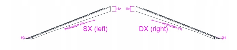 Полоска используется на внутренних сторонах плиты поддона с уклоном 2%, на левой и правой стороне поддона со сливом. Полоса является идеальным эстетическим решением для всей наклонной поверхности и маскирует видимый край наклонной поверхности по отношению к остальной поверхности пола.