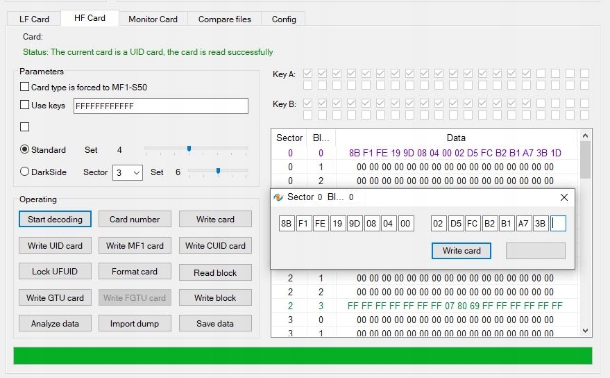 В стандартных картах первый блок памяти, хранящий UID, защищен от записи . В предлагаемых картах имеется возможность модификации блока памяти, благодаря чему можно клонировать стандартные карты S50 Classic 13,56 МГц,... и сохранять полное содержимое памяти, включая первый заводской блок 00.
