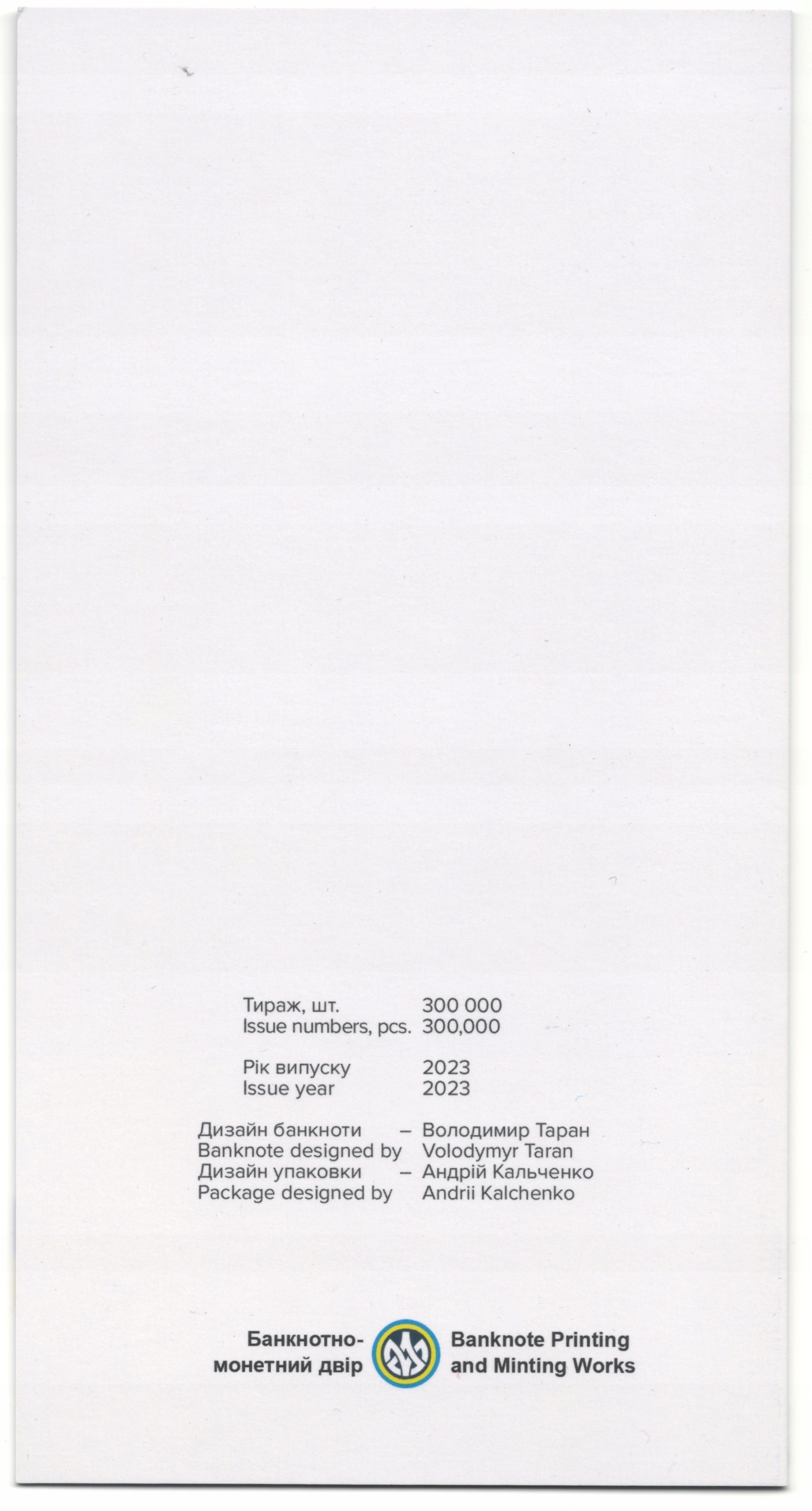 Памятная банкнота введена в обращение в честь стойкости, стойкости, героизма и мужества. украинской нации, которую она демонстрирует в борьбе с вооруженной агрессией России. 24 февраля 2022 года Россия начала полномасштабное вторжение в Украину, объявив «специальную военную операцию». Действия агрессора, который массово и жестоко убивает мирное население, наносит беспощадный артиллерийский огонь и авиаудары, разрушает инфраструктуру и уничтожает населенные пункты, вызывают шок во всем цивилизованном мире! Украина защищает свою независимость, суверенитет, территориальную целостность и право на жизнь! Наша Победа – это победа добра, справедливости, демократии; победа света над тьмой! Памятная банкнота номиналом 20 гривен выпуска 2023 года с подписью Президента Национального банка Украины Андрея Пышного, серия ЗС с номерами 0000001–0300000; содержит защитные элементы текущей номинальной серии банкнот и дополнительные оптически изменяемые защитные элементы; размер банкноты 80 х 165 мм.