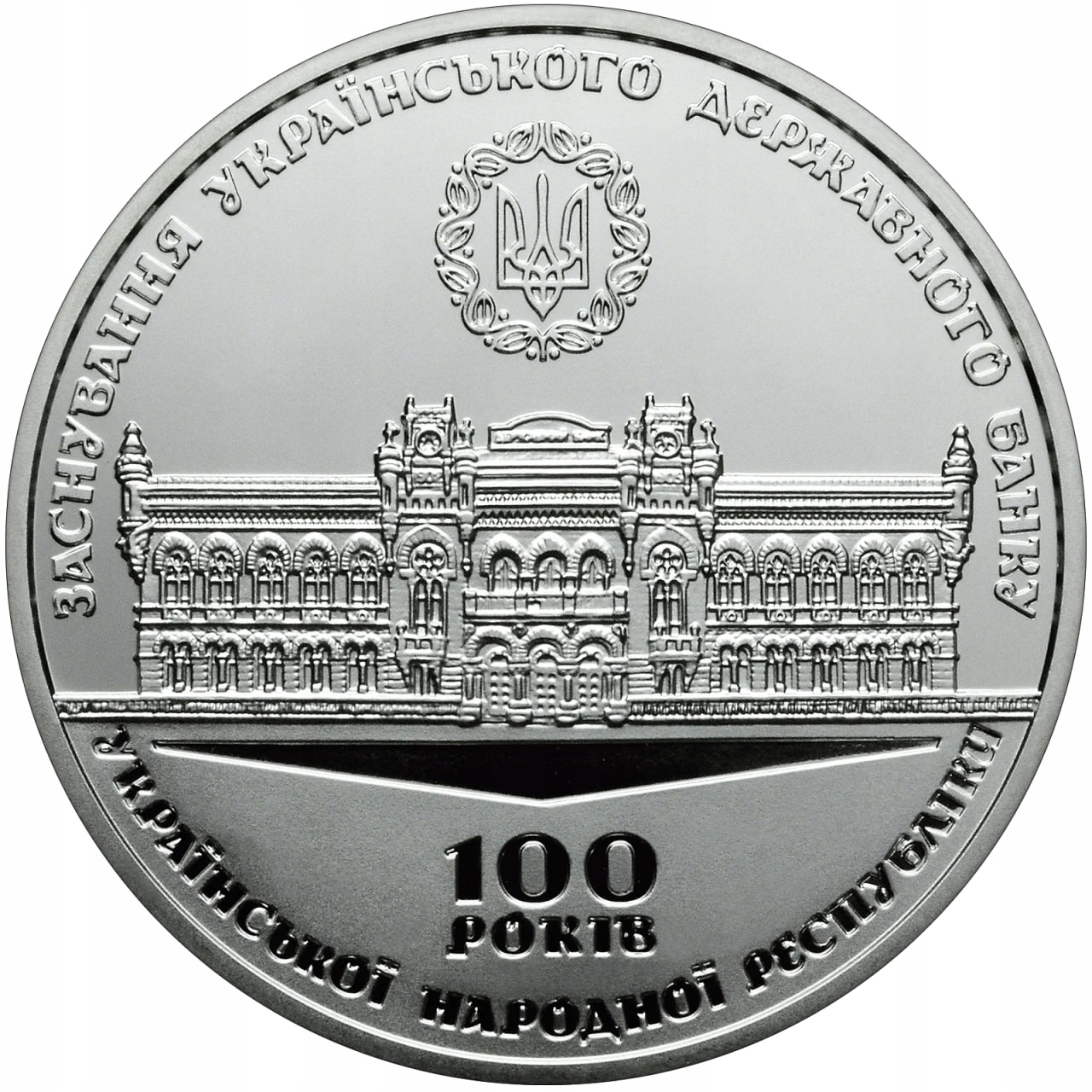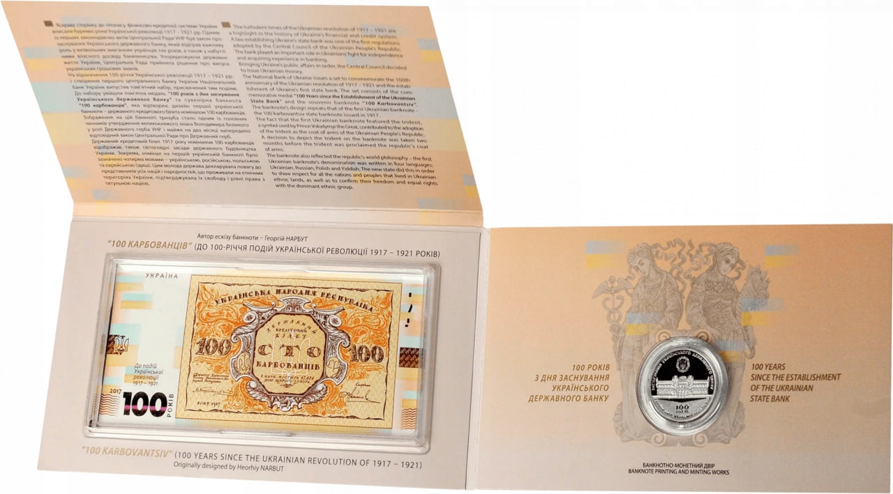 В ознаменование 100-летия событий Украинской революции 1917 - 1921 годов и появления первых украинских бумажных денег Национальный банк Украины выпустил памятную банкноту "Сто карбованцев", которая воспроизводит дизайн первой украинской банкноты. - государственная кредитная карта номиналом 100 карбованцев (автор эскиза банкноты - Георгий Нарбут). Изображение трезубца на этой банкноте стало одним из главных факторов утверждения знака Великого князя Владимира Великого в качестве государственного герба Украинской Народной Республики и почти на порядок предшествовало соответствующему закону Центральной Рады о государственном гербе. два месяца. При изготовлении памятной банкноты использовалась особо защищенная бумага, состоящая из льняных волокон - до 85% и хлопковой целлюлозы. На банкнотной бумаге имеется местный водяной знак в виде трезубца, средний зуб которого увенчан крестом. Размеры банкноты:
