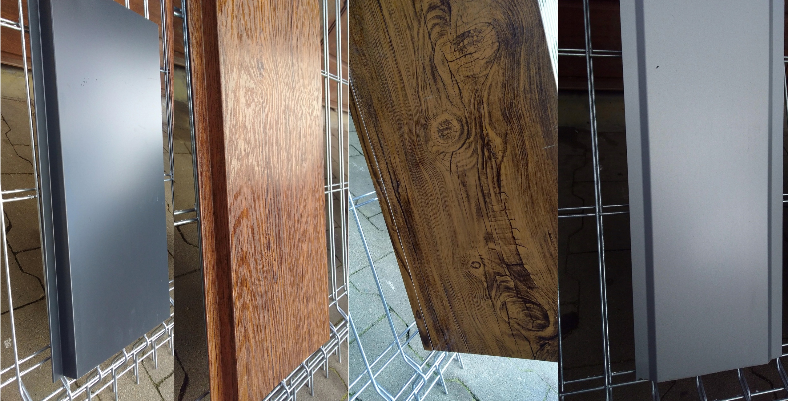 Навес изготовлен из листового металла с широкими рельефами, напоминающими вертикальный стоячий фальц, цвет RAL 7016, матовый антрацит.