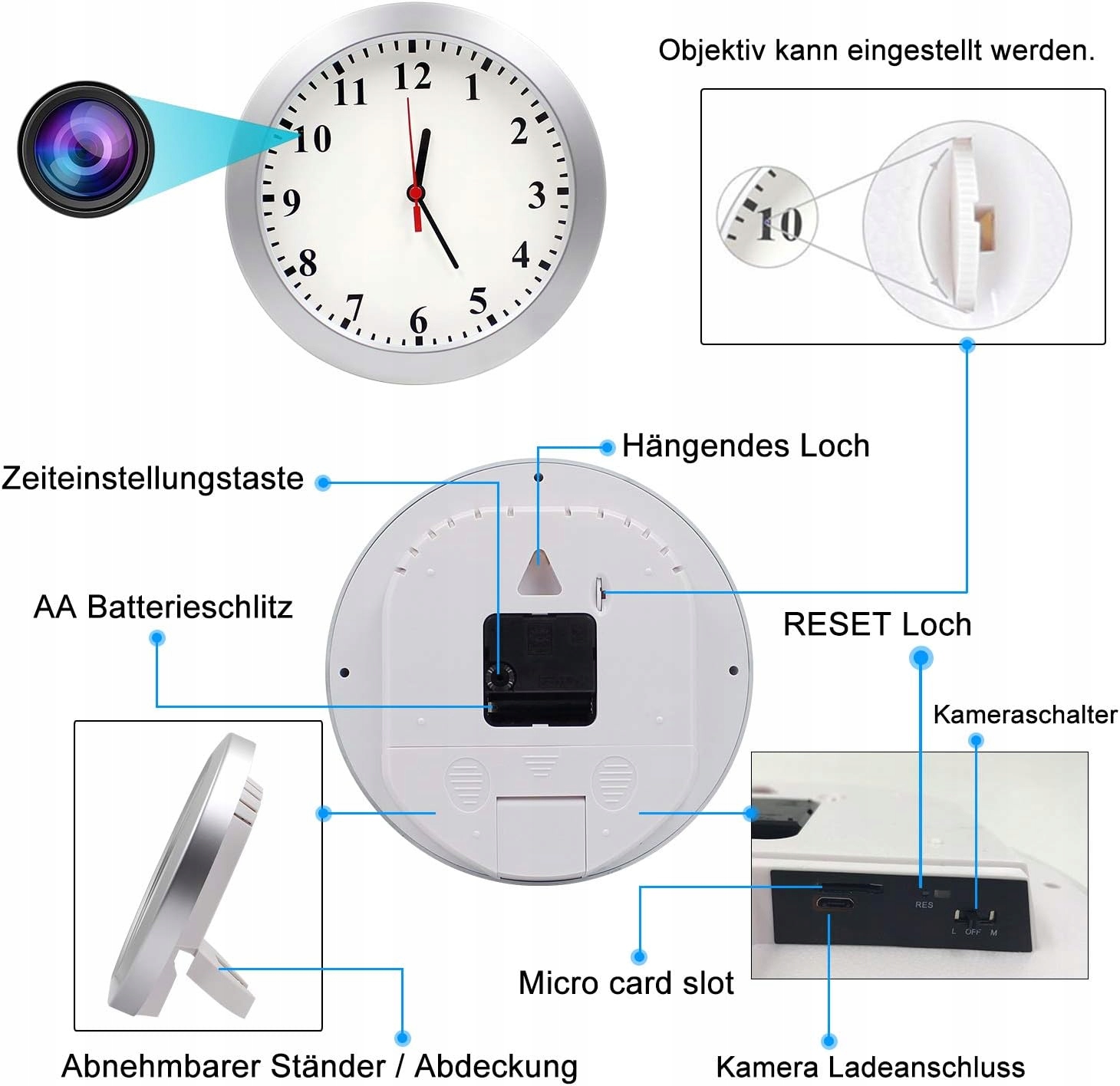 <р> 【Камера наблюдения специальной конструкции】: объектив камеры не требует проводов и беспорядка. Просто повесьте его на стену. Он может записывать видео с разрешением 1280x720 пикселей и частотой 30 кадров в секунду. Идеальный инструмент для контроля безопасности дома и в офисе. <р> 【Циклическая запись и регулируемый объектив камеры】: записывает видео 1920 x 1080p со скоростью 30 кадров в секунду, которые сохраняются на карту каждые 3 минуты. Циклическое сохранение поддерживает автоматическую перезапись самых старых файлов при заполнении памяти. Поддерживает карты micro SD до 128 ГБ (не входят в комплект). Вы можете нажать кнопку регулировки на задней стороне настенных часов, чтобы отрегулировать угол линзы в соответствии с положением настенных часов. <р> 【Обнаружение движения PIR】: автоматически записывает видео при распознавании движения и сохраняет его на карте каждые 2 минуты. Когда движущийся объект покидает зону камеры, камера автоматически останавливается после записи в течение 2 минут и сохраняет изображение на карте памяти, экономя много места. Запечатлевая важные моменты, вам не придется часто удалять ненужные видео. <р> 【Срок службы батареи камеры 8 часов】: встроенный литий-полимерный аккумулятор емкостью 1000 мАч обеспечивает 8-9 часов непрерывной записи видео после полной зарядки. Длительное время автономной работы в режиме ожидания до 8–9 часов, когда камера находится в режиме обнаружения движения (движение не обнаружено). <р> 【Простота в эксплуатации и обещание】: нет необходимости устанавливать какое-либо программное обеспечение, одна кнопка, очень проста в эксплуатации. Просто вставьте карту micro SD, и можно начинать запись видео. <р> Уникальные дизайнерские настенные часы <р> Это камера домашней безопасности с разрешением 1080p (8,7 дюйма) и встроенным невидимым объективом. Это настоящие часы, их можно повесить на стену или поставить на стол, идеальная камера домашнего наблюдения.✅Параметры продукта