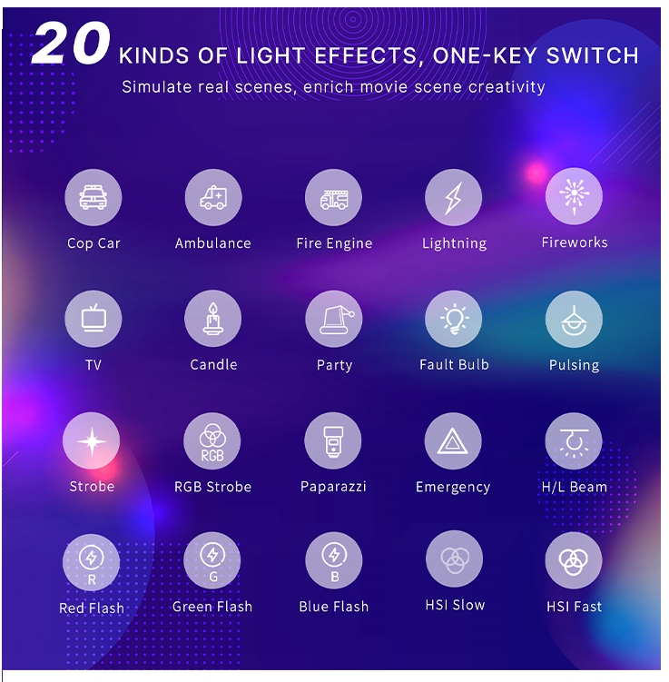 20 режимов освещения на выбор среди прочего стимулирующие свет: пульсирующий, свечи, дискотека, сирены скорой помощи, сирены полицейских машин, фейерверки, телевизор, перегорание лампочек, стробоскопические эффекты.