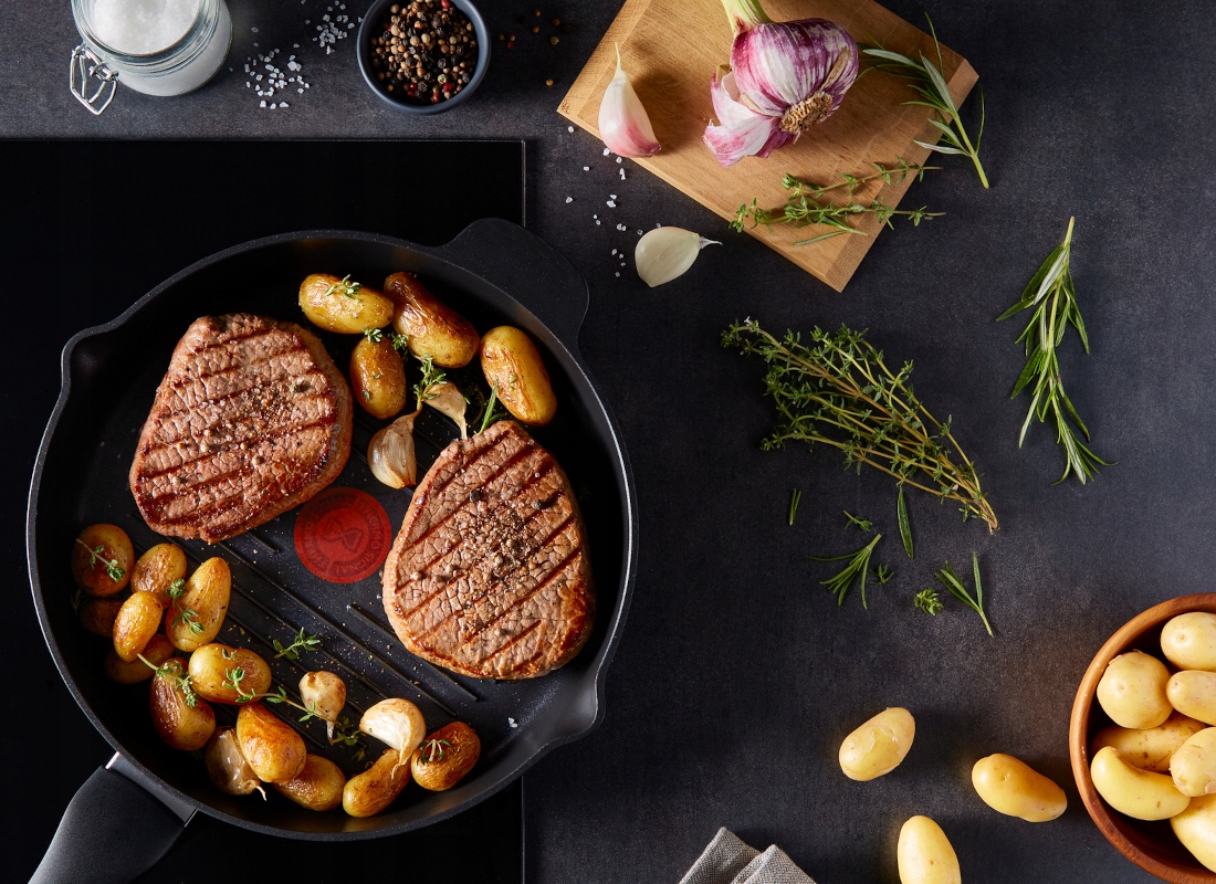 Индикатор горит красным, когда сковорода нагрета до идеальной температуры для начала жарки. Это обеспечивает здоровое и вкусное приготовление пищи, сохраняя при этом максимум вкуса и питательных веществ.