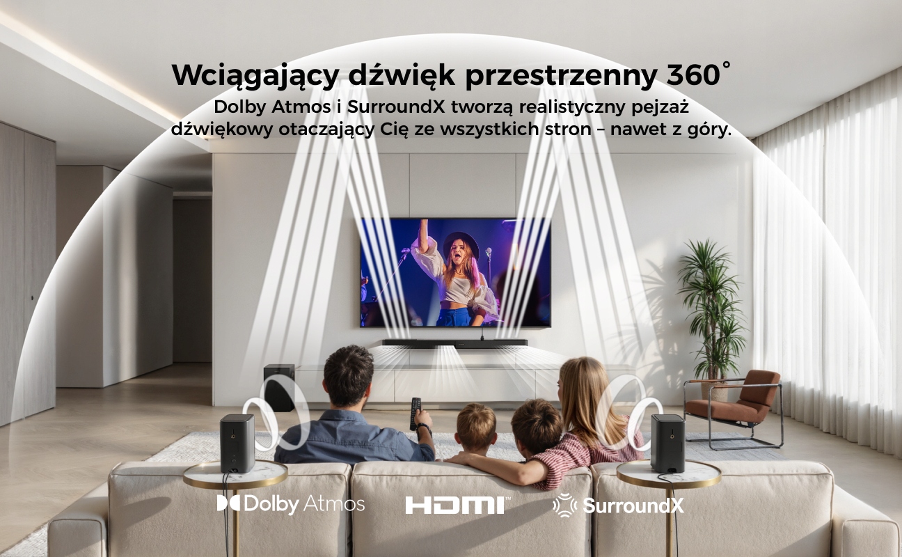 Технология SurroundX™ сочетает в себе два задних динамика объемного звучания и два динамика Atmos для создания настоящего звукового поля на 360°. Благодаря интеллектуальным пространственным алгоритмам система точно позиционирует звук вокруг вас и над вами, улучшая Dolby Atmos с более естественной трехмерной звуковой сценой.