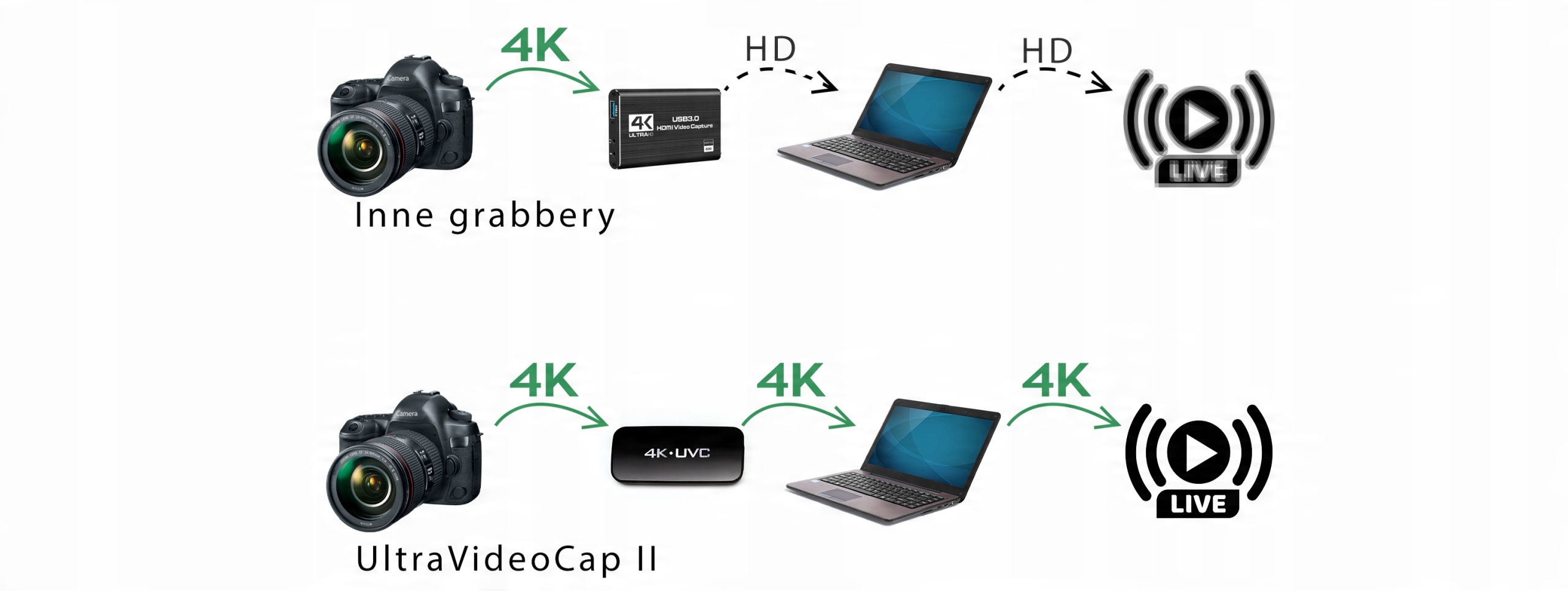 UltraVideoCap II позволяет осуществлять запись и передачу в разрешении 4K. Отправляет несжатое изображение высочайшего профессионального качества (форматы YUY2, NV12 без потерь и полный RGB без субдискретизации цветности) вместе с сопровождающим звуком на ваш компьютер.