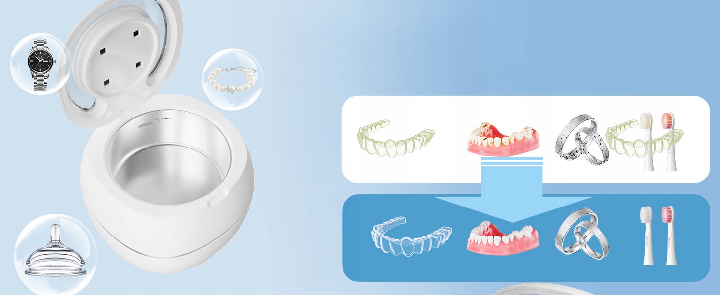 Наш ультразвуковой очиститель спроектирован с учетом минимального пространства и идеально подходит для использования дома и в поездках. В резервуаре из нержавеющей стали объемом 180 мл достаточно места для различных мелких предметов, что идеально подходит для людей с зубными протезами или брекетами, пожилых людей с зубными протезами и людей, носящих украшения.