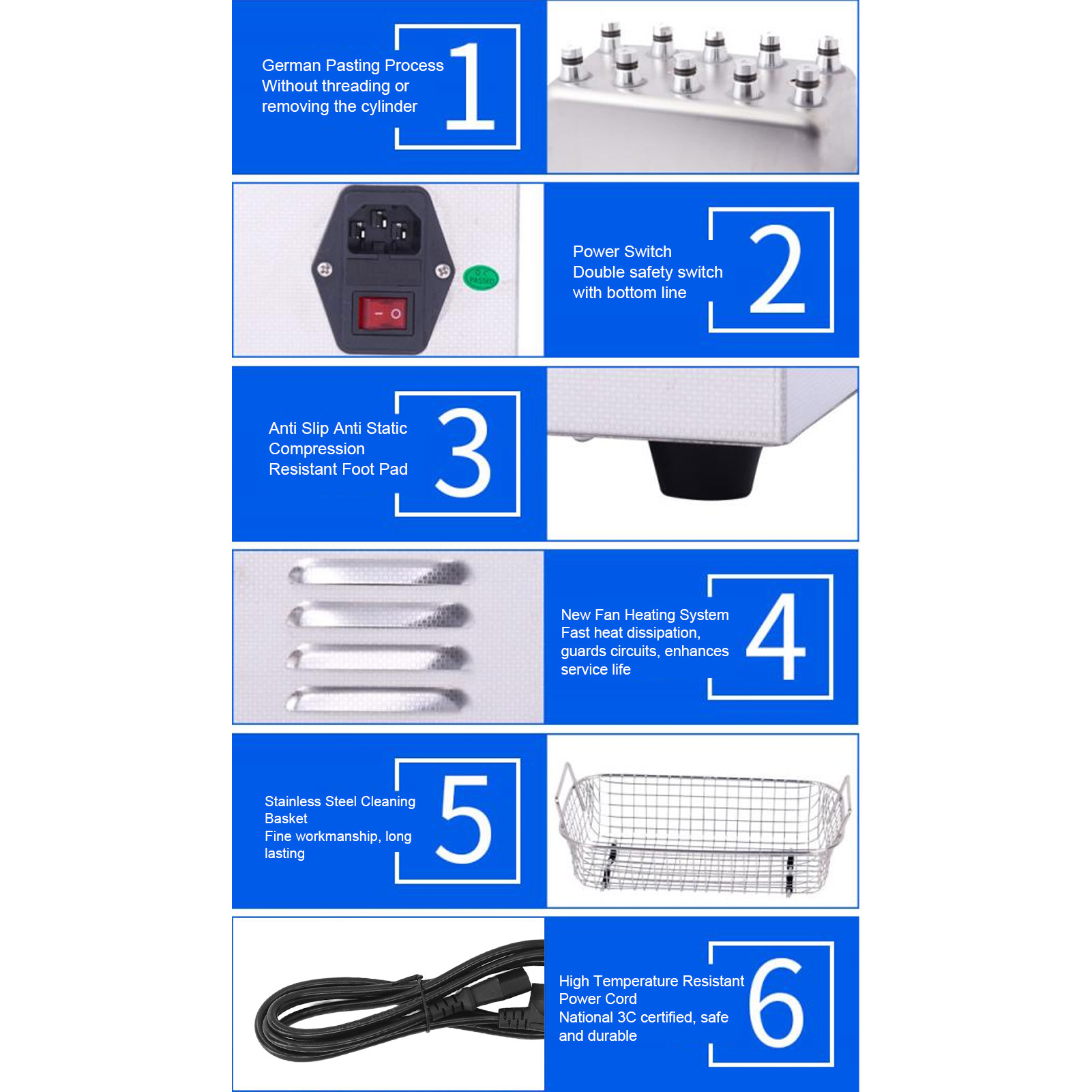5. [Универсальное применение] Этот ультразвуковой очиститель идеально подходит для использования в больницах, фабриках, школах, исследовательских институтах и различных отраслях промышленности, идеально подходит для очистки инструментов, электронных устройств, ювелирных изделий, стеклянной посуды и многого другого.