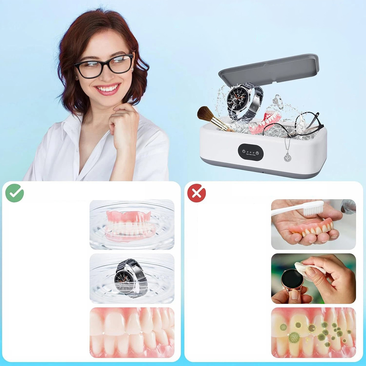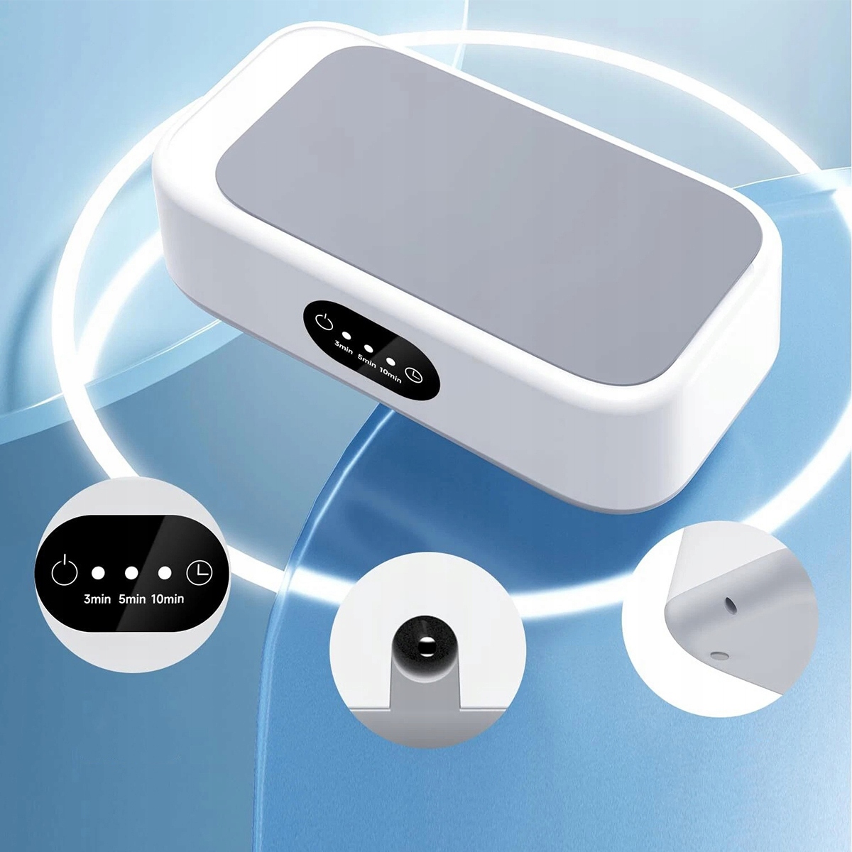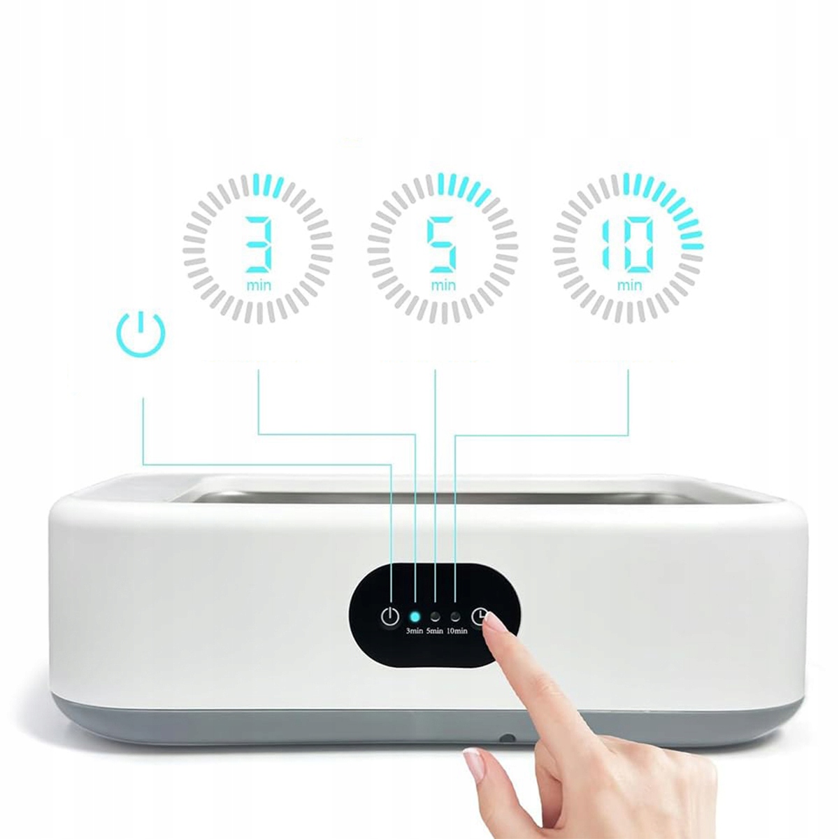 【3 режимы очистки】 Запуск ультразвуковой стиральной машины с одной кнопкой. Есть три режима на выбор: 3/5/10 минут. Обычно вы можете использовать водопроводную воду и жидкость для мытья посуды. Во время работы устройство дает тихое «гудение». Примечание. Налейте воду в раковину перед запуском устройства, в противном случае устройство может быть повреждено. Для лучших результатов очистки мы рекомендуем добавить соответствующий чистящий агент для ультразвуковой ванны.