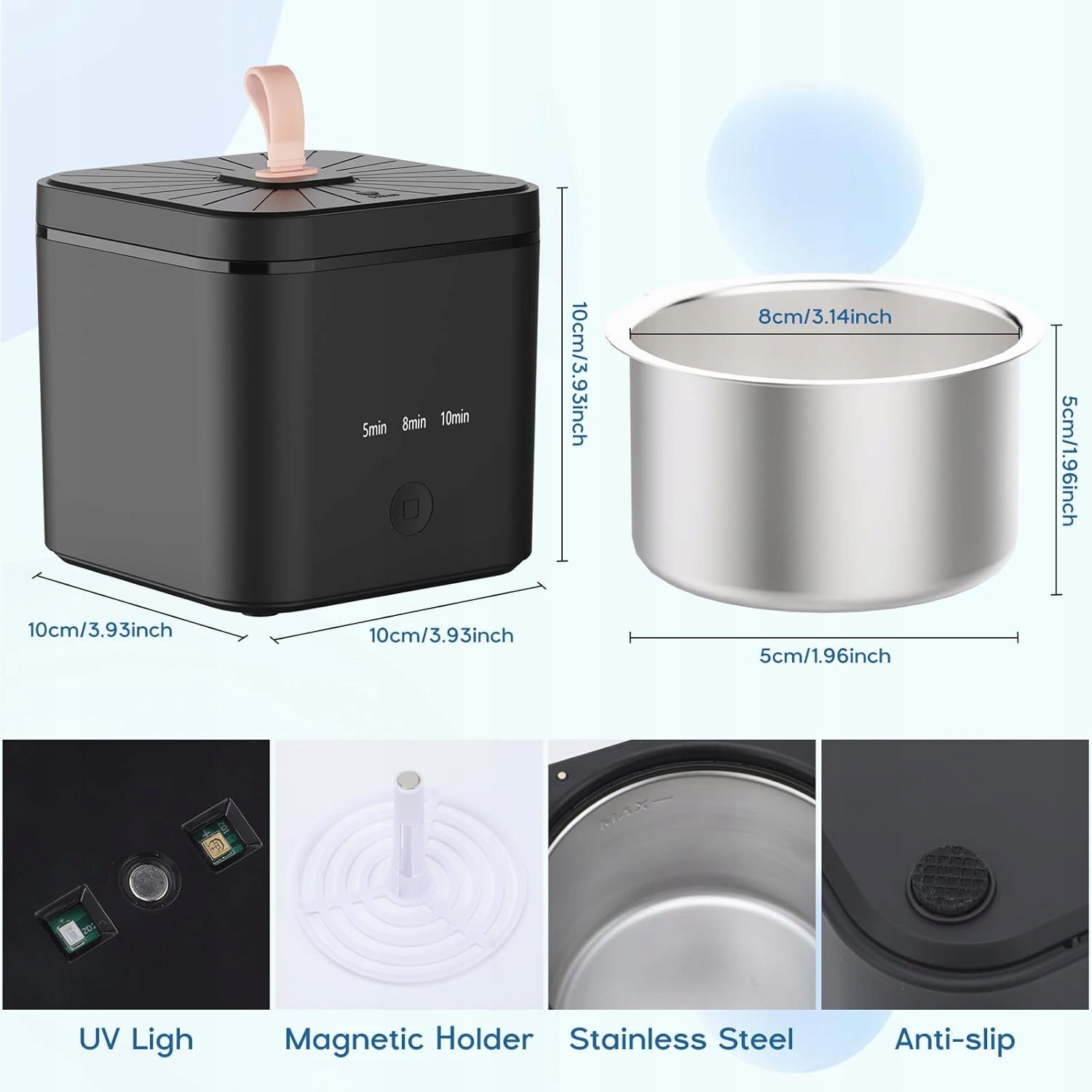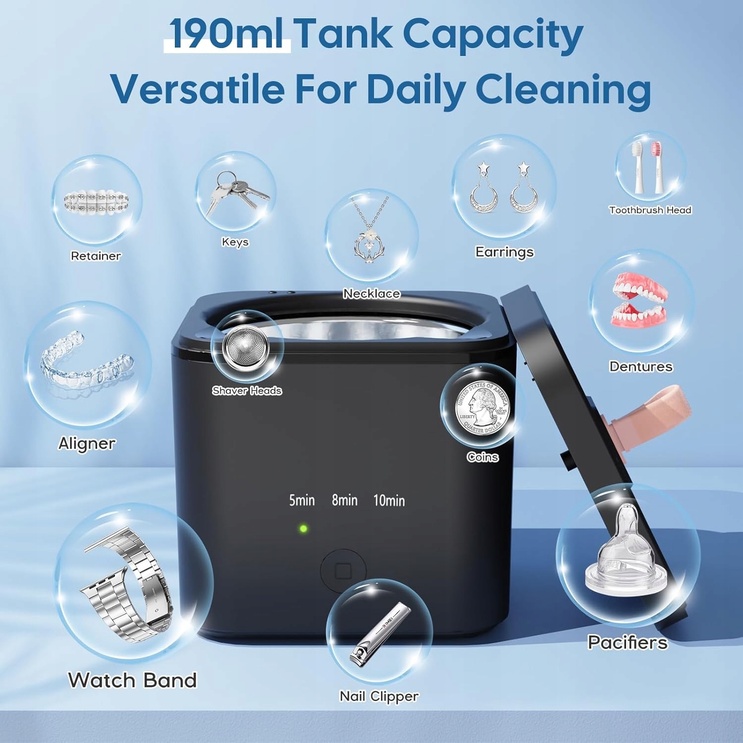 ?Портативный? Компактный и портативный ультразвуковой очиститель ювелирных изделий емкостью 190 мл удовлетворяет ваши ежедневные потребности в чистке различных предметов. Съемный шнур питания позволяет брать его с собой куда угодно — дома, в путешествие или в офис — для оптимальной чистоты ваших вещей.