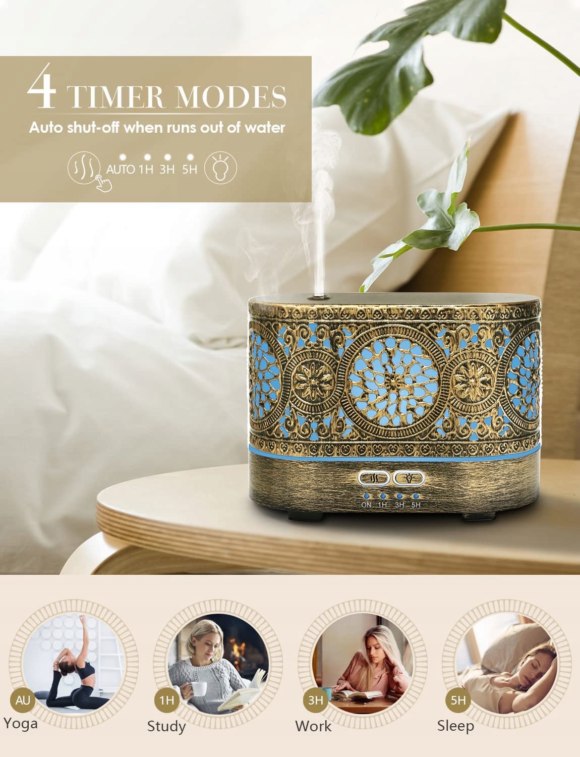 Металлический диффузор эфирного масла - диффузоры SALKING для Эфирные масла с золотистым дизайном, этот классический диффузор станет идеальным дополнением аромата и стиля вашего дома. Благодаря ароматам любимых эфирных масел он мягко распределяет пар, пропитанный эфирными маслами, по помещению, придавая интерьеру ощущение роскошного комфорта. ✅ 7 разноцветных лампочек и таймер — диффузор эфирного масла имеет 4 режима настройки времени: ВКЛ/1 час/3 часа/5 часов. Нажмите кнопку освещения масляного диффузора, чтобы выбрать необходимый цвет. Вы также можете включить режим автоматического освещения, чтобы расслабиться, или выключить все освещение для полной темноты. Мелкий прохладный туман распространяет ароматические свойства по всему воздуху, а красочный светодиодный свет помогает создать желаемую атмосферу. ✅ Автоматическое отключение без BPA и воды. В увлажнителе с прохладным туманом используются те же безопасные и экологически чистые полипропиленовые материалы, которые используются для изготовления детских бутылочек, которые не содержат BPA. Когда в масляном диффузоре заканчивается вода, наши датчики автоматически отключают диффузор, чтобы вы могли быть спокойны. Этот ароматерапевтический диффузор превращает воду и эфирные масла в ароматный туман на срок до 15 часов благодаря резервуару для воды емкостью 300 мл. ✅ Романтический домашний декор и идея подарка — украсьте любое пространство и улучшите атмосферу с помощью наших удивительных диффузоров для ароматерапии. Красочный свет с дополнительным эффектом свечи и удивительный уникальный дизайн эпохи Возрождения создадут романтическую атмосферу в любом пространстве. Это также идеальный подарок на день рождения, рождественский подарок для друга или семьи, и его можно использовать в качестве ароматерапевтического диффузора/увлажнителя/очистителя воздуха/ночника.