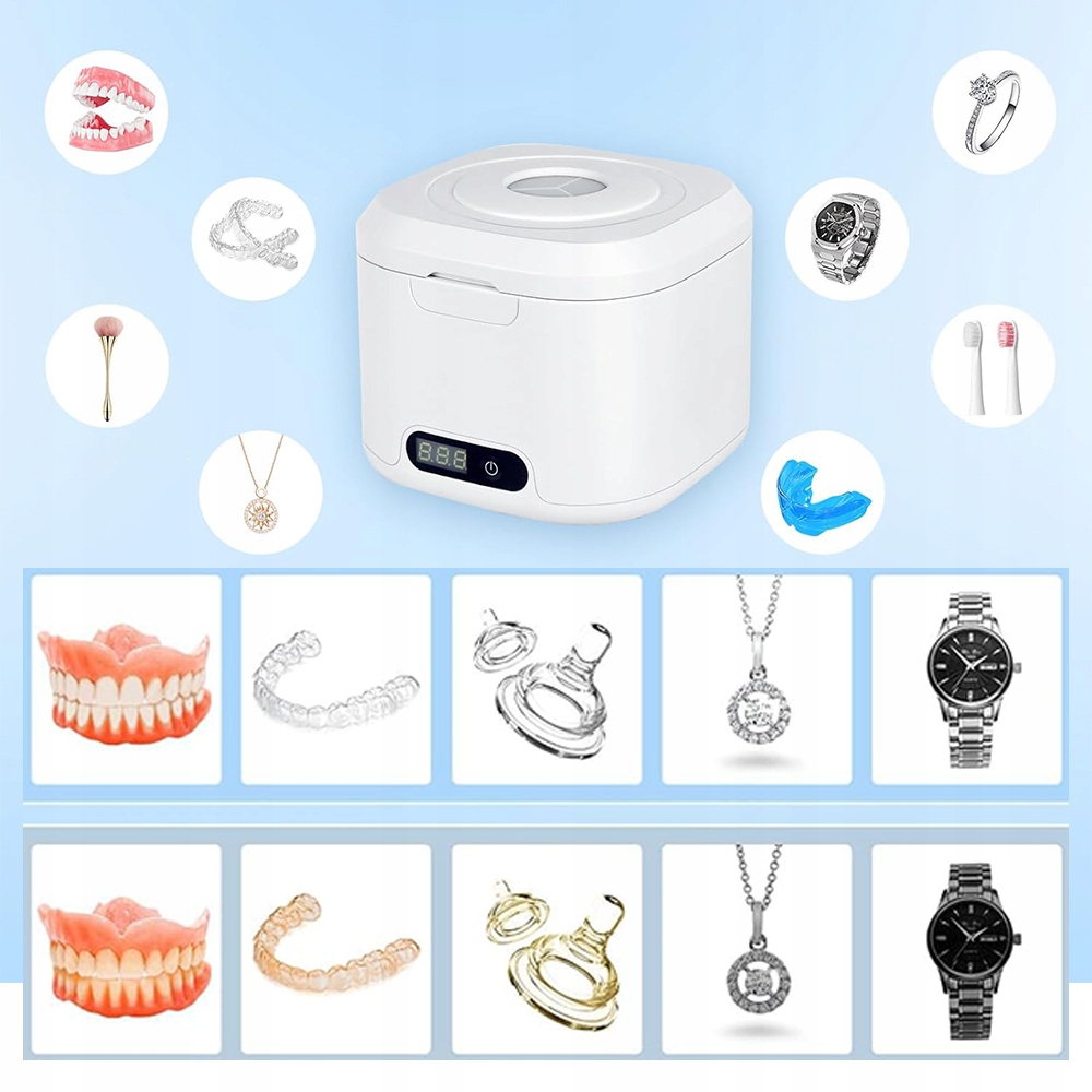 Это устройство ультразвуковой чистки использует высокочастотные звуковые волны, которые эффективно удаляют частицы грязи с зубных протезов, брекетов, насадок зубных щеток и даже ювелирных изделий.