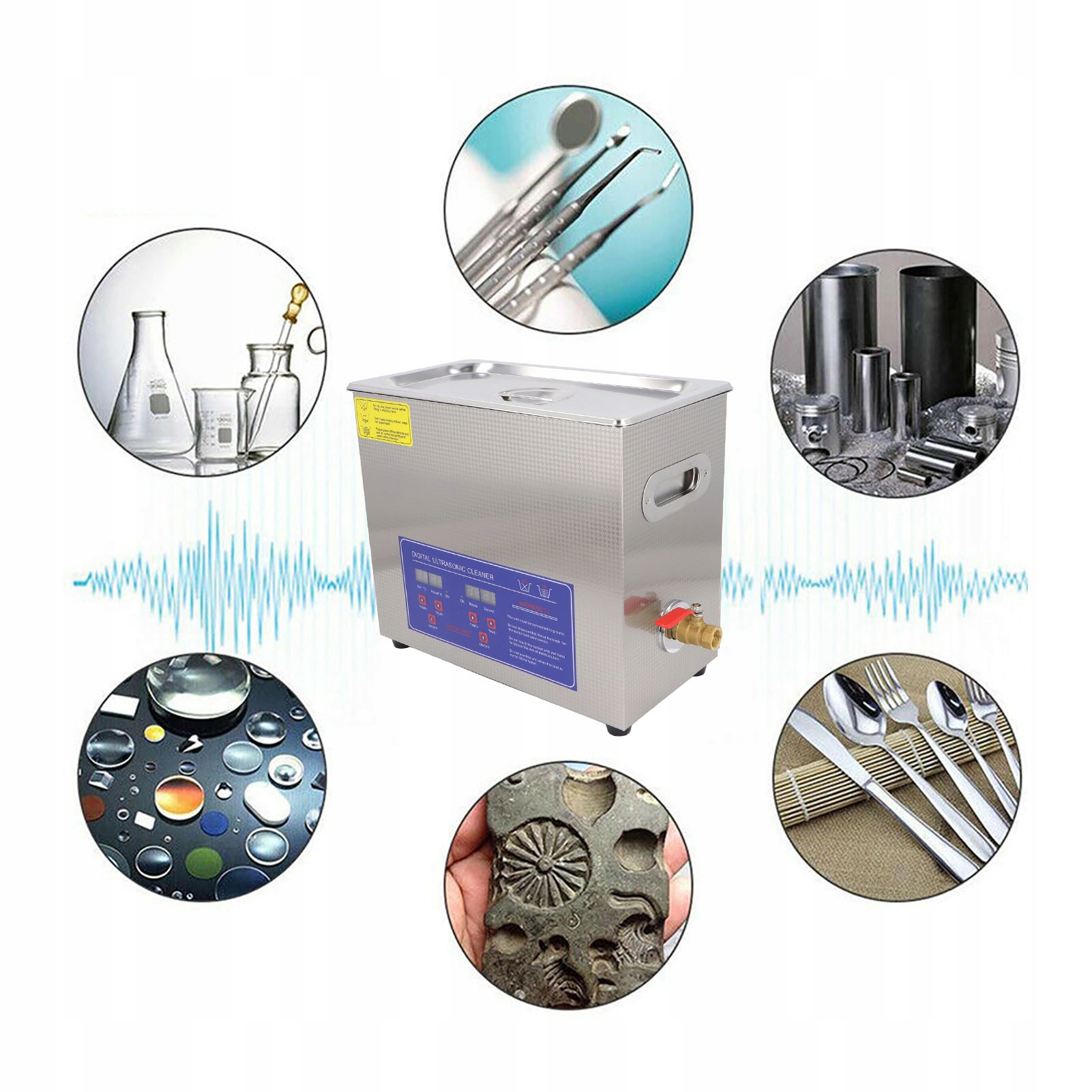 1. Эффективная очистка: ультразвуковой очиститель объемом 6 л имеет мощность ультразвука 180 Вт, мощность нагрева 300 Вт и частоту ультразвука 40 кГц, обеспечивая тщательную очистку инструментов, электронных устройств, печатных плат, ювелирных изделий и многого другого.