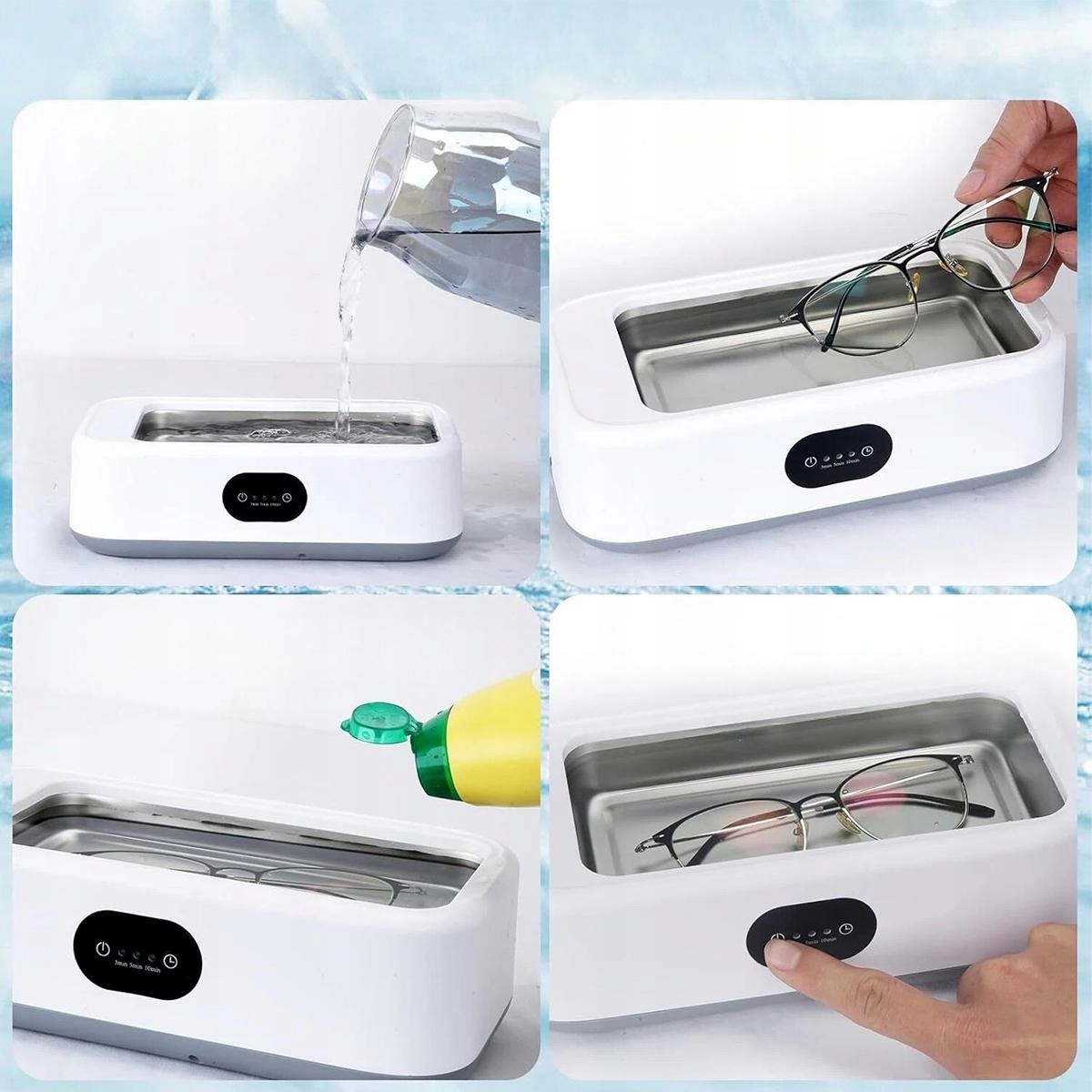 Это ультразвуковое устройство имеет емкость 640 мл и может использоваться для чистки ожерелий, колец, сережек, очков, водонепроницаемых часов, бритв, зубных щеток, вставных зубов, наконечников ручек, печатающих головок, штампов, металлических аксессуаров, металлической посуды, сосок, косметических инструментов, маленьких детских игрушек и т. д. Компактный корпус не занимает много места. Подходит для использования дома или брать с собой в путешествие.