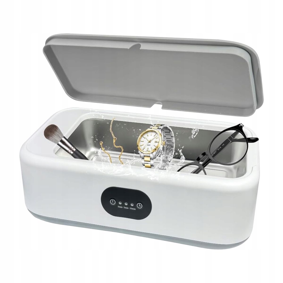 Устройство ультразвуковой очистки одной кнопкой. На выбор есть три режима: 3/5/10 минут. Устройство ультразвуковой очистки. Обычно можно использовать водопроводную воду и жидкость для мытья посуды. Во время работы устройство издает легкий «жужжащий» звук. Примечание. Перед запуском устройства налейте воду в раковину, в противном случае устройство может быть повреждено. Для лучшего результата очистки рекомендуется добавлять в ультразвуковую ванну чистящее средство, подходящее для очищаемого предмета.
