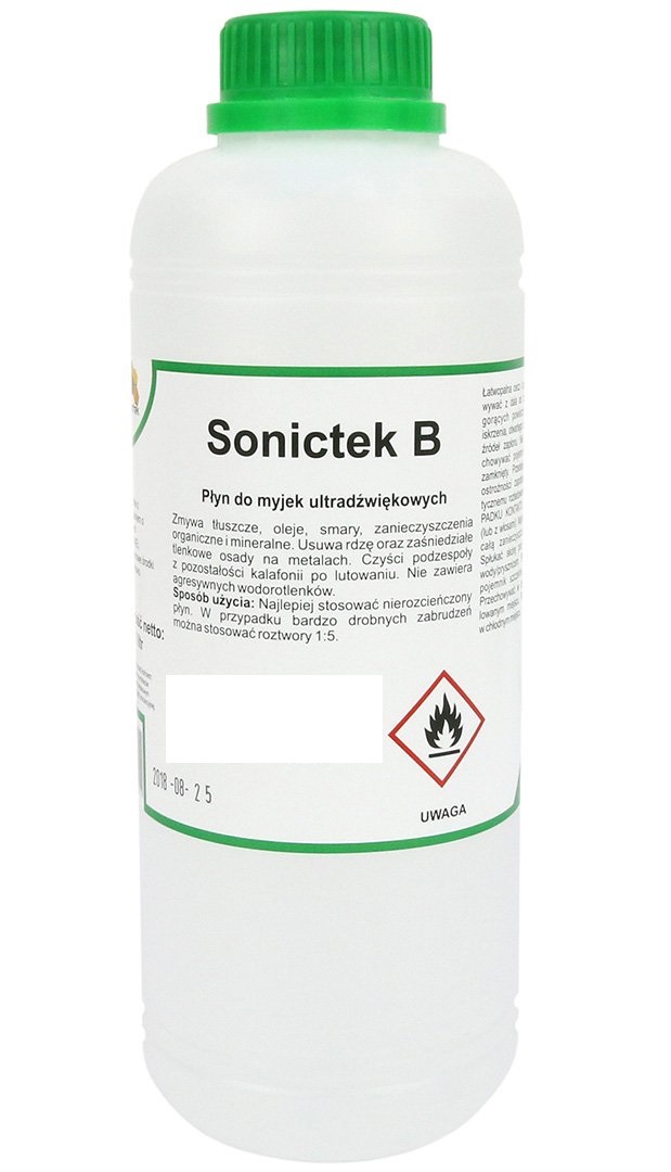 Жидкость для ультразвуковой очистки Sonictek B удаляет жиры, масла, жиры, органические и минеральные загрязнения. Удаляет ржавчину, потускнения, оксидные отложения на металлах. Содержит средство для удаления накипи и хелатирующее вещество, связывающее ионы металлов. Sonictek B быстро и эффективно очищает детали от остатков флюса и канифоли после пайки. Химически нейтрален по отношению к широко используемым материалам. Произведено на основе деминерализованной воды. Жидкость имеет нейтральный pH (около 6). Не содержит агрессивных гидроксидов. Отлично подходит для чистки монет и украшений из драгоценных и цветных металлов. Растворяет соли, нерастворимые в воде. Не вызывает коррозии кожи, металлов, пластмасс и других материалов.