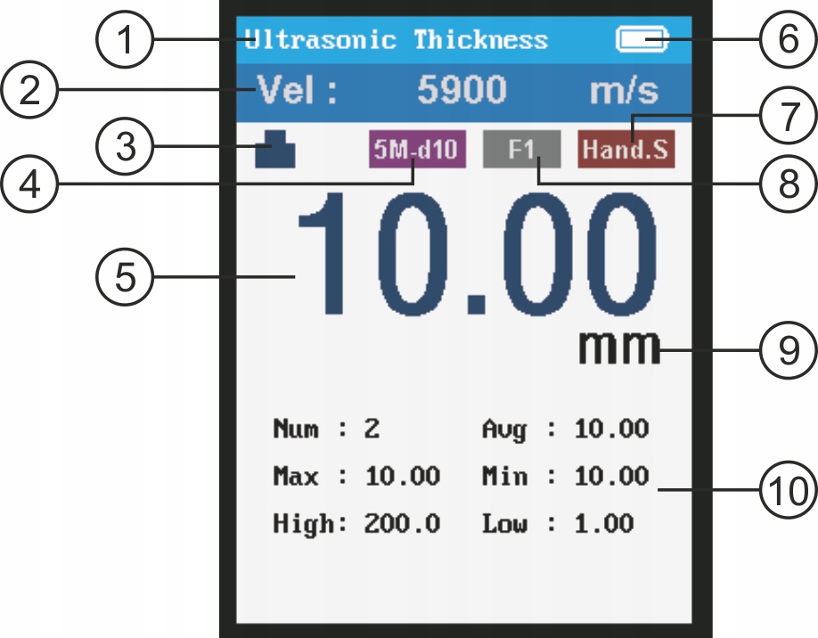 Прибор можно использовать для измерения толщины любого материала, который хорошо проводит ультразвуковые волны и у которых верхняя и нижняя поверхности параллельны друг другу, например, металл, пластик, керамика и стекло, алюминий, медь, золото, смола, вода, глицерин и т. д., за исключением чугуна, частицы которого слишком велики.< /п>