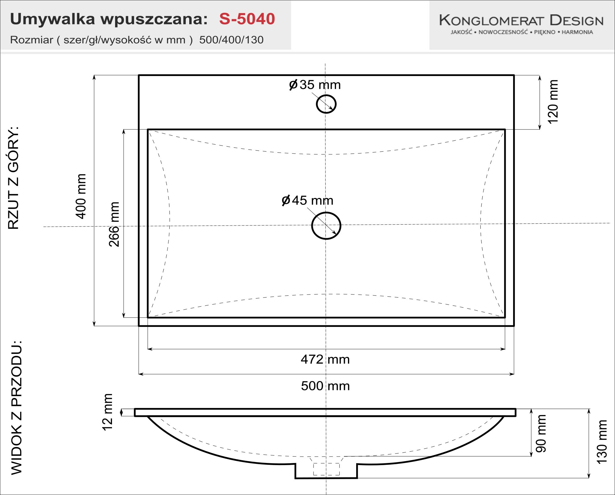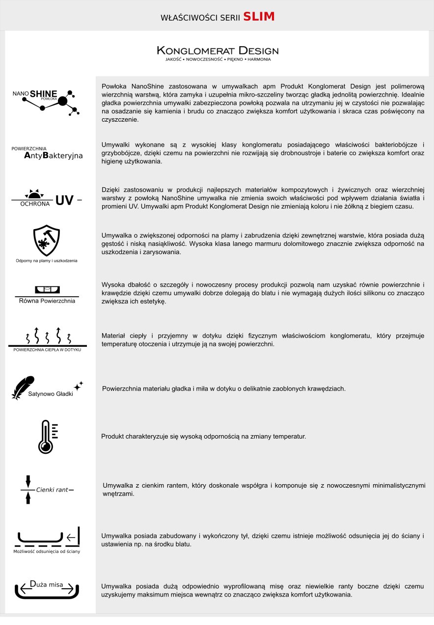 Для производства использовался высококачественный конгломерат и смолы, что делает умывальник, несмотря на небольшой вес, очень прочным и идеальным для повседневного использования. Умывальник предназначен для установки на столешницу в заранее подготовленное отверстие. Отверстие под смеситель диаметром 3,5 см и сифон 4,5 см, стандартизированные для соответствия 99% сифонов и кранов, доступных на польском рынке.