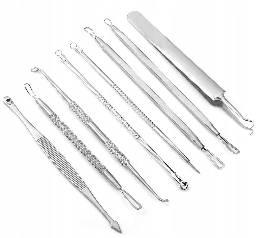 Набор из 8 ложек для очищения кожи лица от несовершенств. Благодаря ему можно гигиенично удалить с лица все загрязнения, в отличие от ручного удаления. Ручное удаление несовершенств разрушает кожу и разносит бактерии по всему лицу.