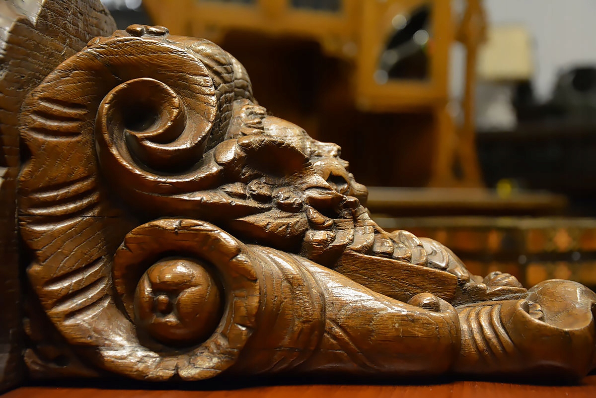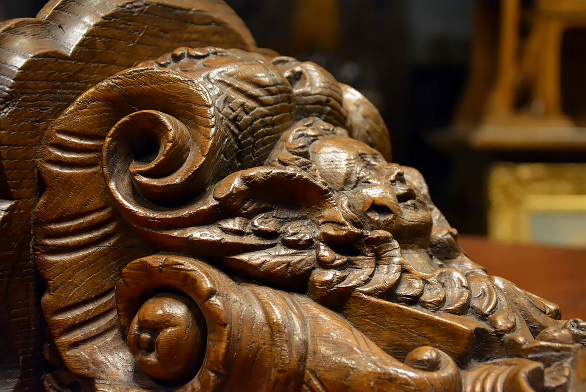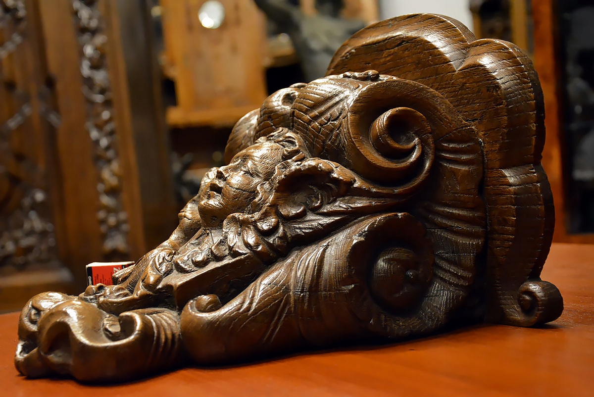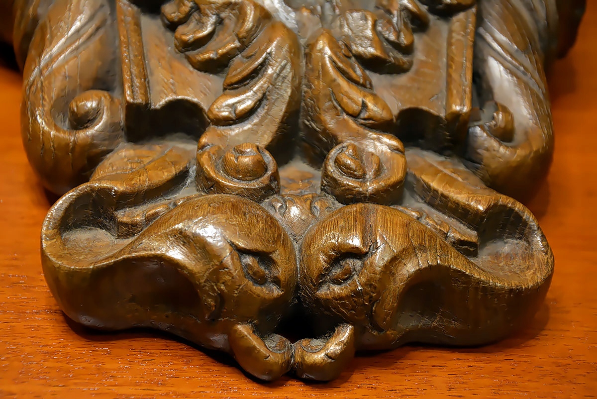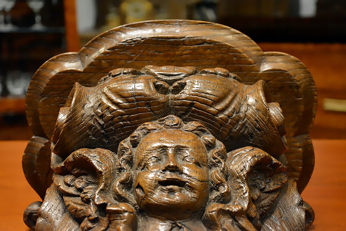 Консоль изысканно профилированной формы, богато украшенная волютивными мотивами, листьями аканта и маскароном в виде выразительно обрамленного лица. Все выдержано в стиле позднего барокко/рококо, с хорошо заметной благородной структурой старого дуба и красивой патиной, подчеркивающей возраст и подлинность предмета.