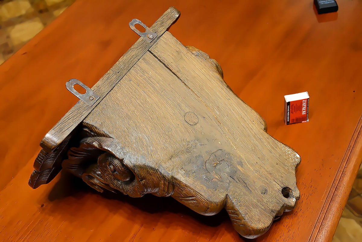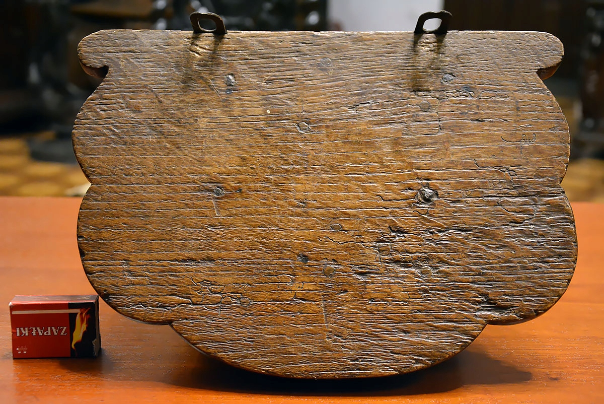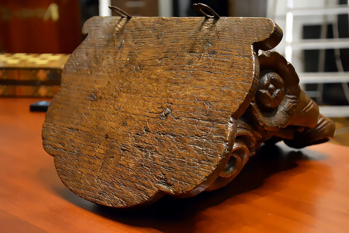 Задняя часть консоли плоская, с сохранением оригинальных элементов крепления, позволяющих разместить ее на стене. Скульптура пластична, с выразительной глубиной и орнаментальными деталями, характерными для резьбы по дереву XVIII века.